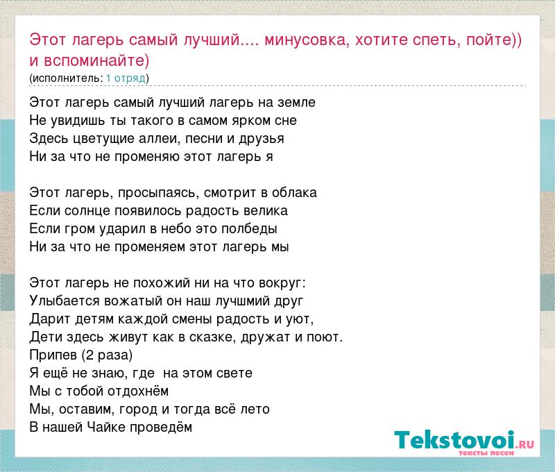 А как ты думаешь, о чем песня "Этот лагерь самый лучший.... минусовка, хотите спеть, пойте)) и вспоминайте)" ?