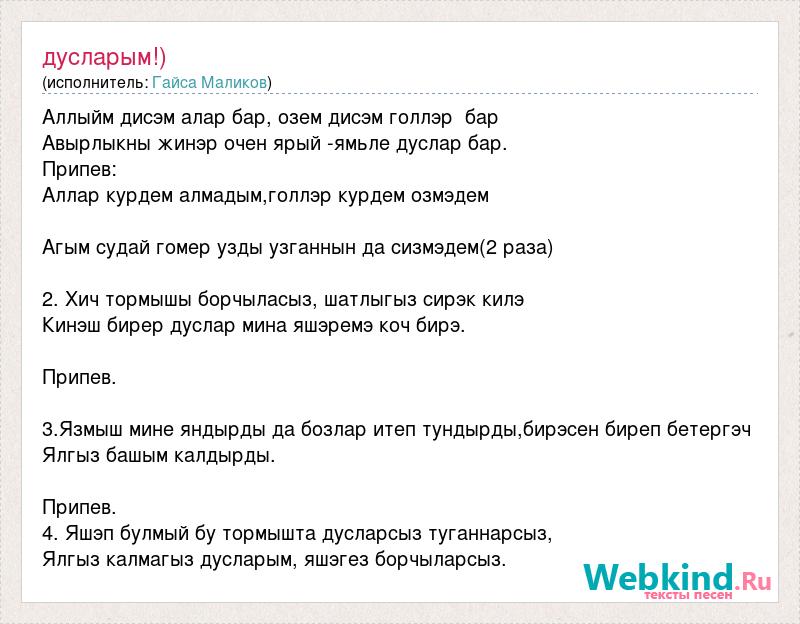 Аллыйм дисэм алар бар, озем дисэм голлэр бар Авырлыкны жинэр очен ярый -ямьле дуслар бар. Припев: Аллар курдем алмадым,голлэр курдем озмэдем Агым судай гомер узды узганнын да сизмэдем(2 раза) 2. Хич тормышы борчыласыз, шатлыгыз сирэк килэ Кинэш бирер дуслар мина яшэремэ коч бирэ. Припев. 3.Язмыш мине яндырды да бозлар итеп тундырды,бирэсен биреп бетергэч Ялгыз башым калдырды. Припев. 4. Яшэп булмый бу тормышта дусларсыз туганнарсыз, Ялгыз калмагыз дусларым, яшэгез борчыларсыз.