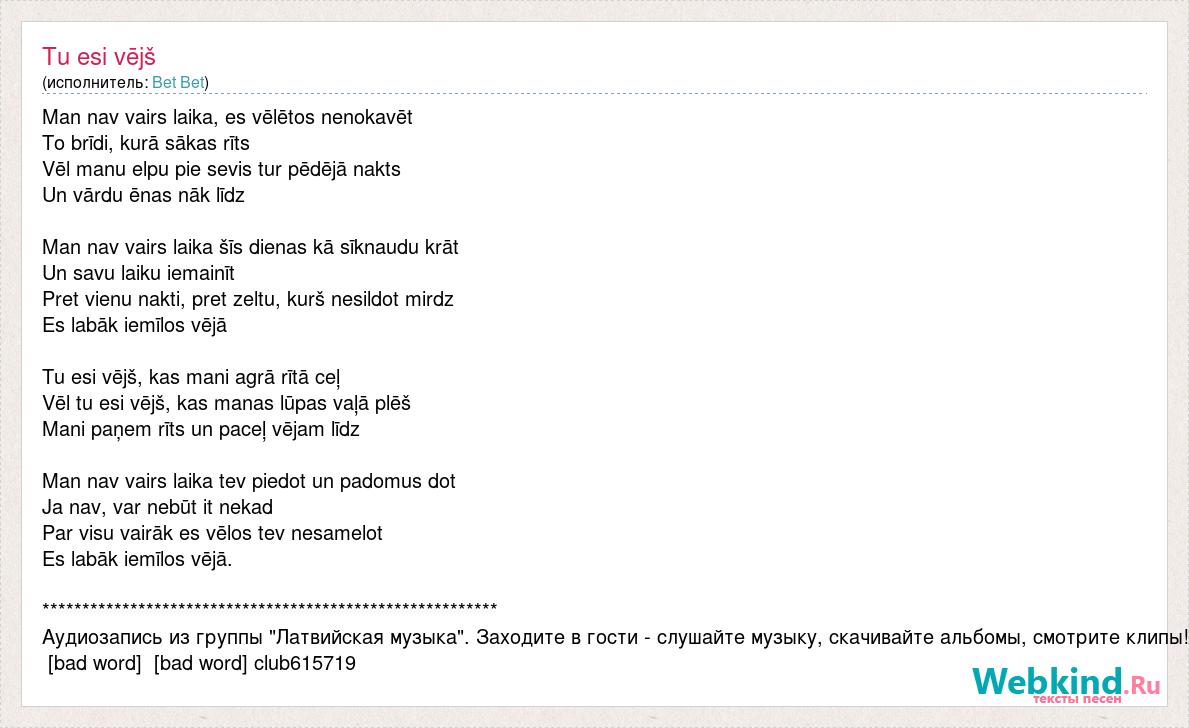 Man nav vairs laika, es vēlētos nenokavēt To brīdi, kurā sākas rīts Vēl manu elpu pie sevis tur pēdējā nakts Un vārdu ēnas nāk līdz Man nav vairs laika šīs dienas kā sīknaudu krāt Un savu laiku iemainīt Pret vienu nakti, pret zeltu, kurš nesildot mirdz Es labāk iemīlos vējā Tu esi vējš, kas mani agrā rītā ceļ Vēl tu esi vējš, kas manas lūpas vaļā plēš Mani paņem rīts un paceļ vējam līdz Man nav vairs laika tev piedot un padomus dot Ja nav, var nebūt it nekad Par visu vairāk es vēlos tev nesamelot Es labāk iemīlos vējā. ********************************************************* Аудиозапись из группы "Латвийская музыка". Заходите в гости - слушайте музыку, скачивайте альбомы, смотрите клипы! [bad word] [bad word] club615719