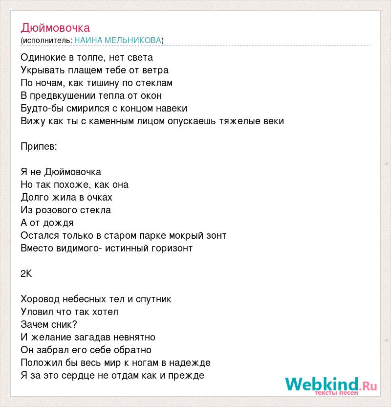 Одинокие в толпе, нет света Укрывать плащем тебе от ветра По ночам, как тишину по стеклам В предвкушении тепла от окон Будто-бы смирился с концом навеки Вижу как ты с каменным лицом опускаешь тяжелые веки Припев: Я не Дюймовочка Но так похоже, как она Долго жила в очках Из розового стекла А от дождя Остался только в старом парке мокрый зонт Вместо видимого- истинный горизонт 2К Хоровод небесных тел и спутник Уловил что так хотел Зачем сник? И желание загадав невнятно Он забрал его себе обратно Положил бы весь мир к ногам в надежде Я за это сердце не отдам как и прежде