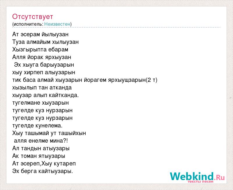 Ат эсерам йылыузан Туза алмайым хылыузан Хызгырыпта ебарам Алля йорак ярхыузан Эх хыуга барыузарын хыу хирпеп алыузарын тик баса алмай хыузарын йорагем ярхыущзарын(2 т) хызылып тан атканда хыузар алып кайтканда. тугелмане хыузарын тугелде куз нурзарын тугелде куз нурзарын тугелде кунелема. Хыу ташымай ут ташыйхын алля енелме мина?! Ал тандын атыузары Ак томан ятыузары Ат эсереп,Хыу кутареп Эх берга кайтыузары.