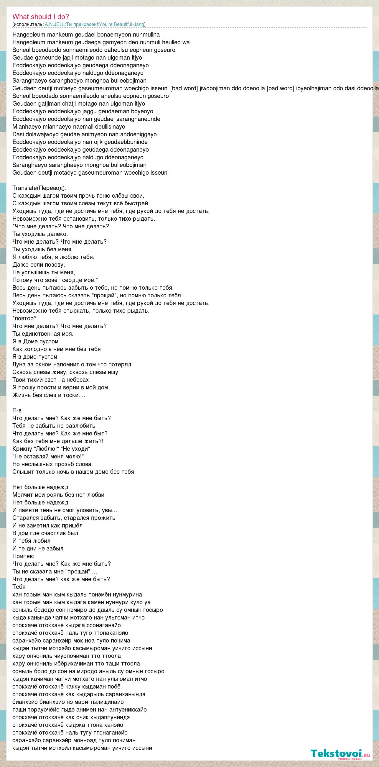 Hangeoleum mankeum geudael bonaemyeon nunmulina Hangeoleum mankeum geudaega gamyeon deo nunmuli heulleo wa Soneul bbeodeodo sonnaemileodo daheulsu eopneun goseuro Geudae ganeunde japji motago nan ulgoman itjyo Eoddeokajyo eoddeokajyo geudaega ddeonaganeyo Eoddeokajyo eoddeokajyo naldugo ddeonaganeyo Saranghaeyo saranghaeyo mongnoa bulleobojiman Geudaen deutji motaeyo gaseumeuroman woechigo isseuni Haruonjongil jiwobojiman ddo ddeoolla Haruonjongil ibyeolhajiman ddo dasi ddeoolla Soneul bbeodado sonnaemileodo aneulsu eopneun goseuro Geudaen gatjiman chatji motago nan ulgoman itjyo Eoddeokajyo eoddeokajyo jaggu geudaeman boyeoyo Eoddeokajyo eoddeokajyo nan geudael saranghaneunde Mianhaeyo mianhaeyo naemali deullisinayo Dasi dolawajwoyo geudae animyeon nan andoeniggayo Eoddeokajyo eoddeokajyo nan ojik geudaebbuninde Eoddeokajyo eoddeokajyo geudaega ddeonaganeyo Eoddeokajyo eoddeokajyo naldugo ddeonaganeyo Saranghaeyo saranghaeyo mongnoa bulleobojiman Geudaen deutji motaeyo gaseumeuroman woechigo isseuni Translate(Перевод): С каждым шагом твоим прочь гоню слёзы свои. С каждым шагом твоим слёзы текут всё быстрей. Уходишь туда, где не достичь мне тебя, где рукой до тебя не достать. Невозможно тебя остановить, только тихо рыдать. *Что мне делать? Что мне делать? Ты уходишь далеко. Что мне делать? Что мне делать? Ты уходишь без меня. Я люблю тебя, я люблю тебя. Даже если позову, Не услышишь ты меня, Потому что зовёт сердце моё.* Весь день пытаюсь забыть о тебе, но помню только тебя. Весь день пытаюсь сказать "прощай", но помню только тебя. Уходишь туда, где не достичь мне тебя, где рукой до тебя не достать. Невозможно тебя отыскать, только тихо рыдать. *повтор* Что мне делать? Что мне делать? Ты единственная моя. Я в Доме пустом Как холодно в нём мне без тебя Я в доме пустом Луна за окном напомнит о том что потерял Сквозь слёзы живу, сквозь слёзы ищу Твой тихий свет на небесах Я прошу прости и верни в мой дом Жизнь без слёз и тоски.... П-в Что делать мне? Как же мне быть? Тебя не забыть не разлюбить Что делать мне? Как же мне быт? Как без тебя мне дальше жить?! Крикну "Люблю!" "Не уходи" "Не оставляй меня молю!" Но неслышных прозьб слова Слышит только ночь в нашем доме без тебя Нет больше надежд Молчит мой рояль без нот любви Нет больше надежд И памяти тень не смог уловить, увы... Старался забыть, старался прожить И не заметил как пришёл В дом где счастлив был И тебя любил И те дни не забыл Припев: Что делать мне? Как же мне быть? Ты не сказала мне "прощай".... Что делать мне? как же мне быть? Тебя хан горым ман кым кыдэль понэмён нунмурина хан горым ман кым кыдэга камён нунмури хуло уа соныль бододо сон нэмиро до даыль су омнын госыро кыдэ канындэ чапчи мотхаго нан ульгоман итчо отокхачё отокхачё кыдэга ссонаганэйо отокхачё отокхачё наль туго ттонаканэйо саранхэйо саранхэйр мок ноа пуло почима кыдэн тытчи мотхэйо касымыроман уичиго иссыни хару ончониль чиуопочиман тто ттоола хару ончониль ибёрихачиман тто тащи ттоола соныль бодо до сон нэ миродо аныль су омнын госыро кыдэн качиман чапчи мотхаго нан ульгоман итчо отокхачё отокхачё чакку кыдэман поёё отокхачё отокхачё как кыдэрыль саранханындэ бианхэйо бианхэйо нэ мари тылищинайо тащи торауочёйо гыдэ анимен нан антуэниккайо отокхачё отокхачё как очик кыдэппуниндэ отокхачё отокхачё кыдэка ттона канэйо отокхачё отокхачё наль тугу ттонаганэйо саранхэйо саранхэйр монноад пуло почиман кыдэн тытчи мотхэйл касымыроман уичиго иссыни