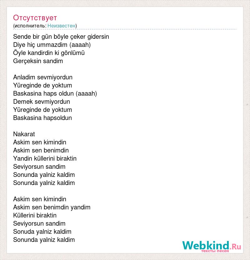 Sende bir gün böyle çeker gidersin Diye hiç ummazdim (aaaah) Öyle kandirdin ki gönlümü Gerçeksin sandim Anladim sevmiyordun Yüreginde de yoktum Baskasina haps oldun (aaaah) Demek sevmiyordun Yüreginde de yoktum Baskasina hapsoldun Nakarat Askim sen kimindin Askim sen benimdin Yandin küllerini biraktin Seviyorsun sandim Sonunda yalniz kaldim Sonunda yalniz kaldim Askim sen kimindin Askim sen benimdin yandim Küllerini biraktin Seviyorsun sandim Sonuda yalniz kaldim Sonunda yalniz kaldim