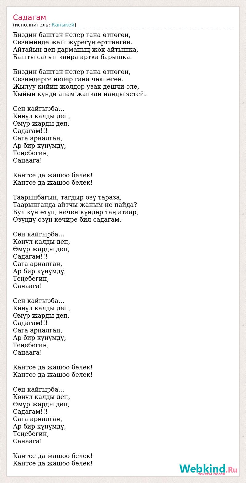 Биздин баштан нелер гана өтпөгөн, Сезимиңде жаш жүрөгүң өрттөнгөн. Айтайын деп дарманың жок айтышка, Башты салып кайра артка барышка. Биздин баштан нелер гана өтпөгөн, Сезимдерге нелер гана чөкпөгөн. Жылуу кийин жолдор узак дешчи эле, Кыйын күндө апам жапкан нанды эстей. Сен кайгырба… Көңүл калды деп, Өмүр жарды деп, Садагам!!! Сага арналган, Ар бир күнүмдү, Теңебегин, Санаага! Кантсе да жашоо белек! Кантсе да жашоо белек! Таарынбагын, тагдыр өзү тараза, Таарынганда айтчы жаным не пайда? Бул күн өтүп, нечен күндөр таң атаар, Өзүңдү өзүң кечире бил садагам. Сен кайгырба… Көңүл калды деп, Өмүр жарды деп, Садагам!!! Сага арналган, Ар бир күнүмдү, Теңебегин, Санаага! Сен кайгырба… Көңүл калды деп, Өмүр жарды деп, Садагам!!! Сага арналган, Ар бир күнүмдү, Теңебегин, Санаага! Кантсе да жашоо белек! Кантсе да жашоо белек! Сен кайгырба… Көңүл калды деп, Өмүр жарды деп, Садагам!!! Сага арналган, Ар бир күнүмдү, Теңебегин, Санаага! Кантсе да жашоо белек! Кантсе да жашоо белек!