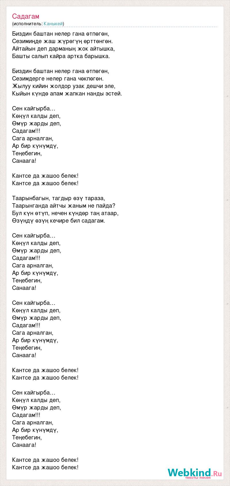 Биздин баштан нелер гана өтпөгөн, Сезимиңде жаш жүрөгүң өрттөнгөн. Айтайын деп дарманың жок айтышка, Башты салып кайра артка барышка. Биздин баштан нелер гана өтпөгөн, Сезимдерге нелер гана чөкпөгөн. Жылуу кийин жолдор узак дешчи эле, Кыйын күндө апам жапкан нанды эстей. Сен кайгырба… Көңүл калды деп, Өмүр жарды деп, Садагам!!! Сага арналган, Ар бир күнүмдү, Теңебегин, Санаага! Кантсе да жашоо белек! Кантсе да жашоо белек! Таарынбагын, тагдыр өзү тараза, Таарынганда айтчы жаным не пайда? Бул күн өтүп, нечен күндөр таң атаар, Өзүңдү өзүң кечире бил садагам. Сен кайгырба… Көңүл калды деп, Өмүр жарды деп, Садагам!!! Сага арналган, Ар бир күнүмдү, Теңебегин, Санаага! Сен кайгырба… Көңүл калды деп, Өмүр жарды деп, Садагам!!! Сага арналган, Ар бир күнүмдү, Теңебегин, Санаага! Кантсе да жашоо белек! Кантсе да жашоо белек! Сен кайгырба… Көңүл калды деп, Өмүр жарды деп, Садагам!!! Сага арналган, Ар бир күнүмдү, Теңебегин, Санаага! Кантсе да жашоо белек! Кантсе да жашоо белек!
