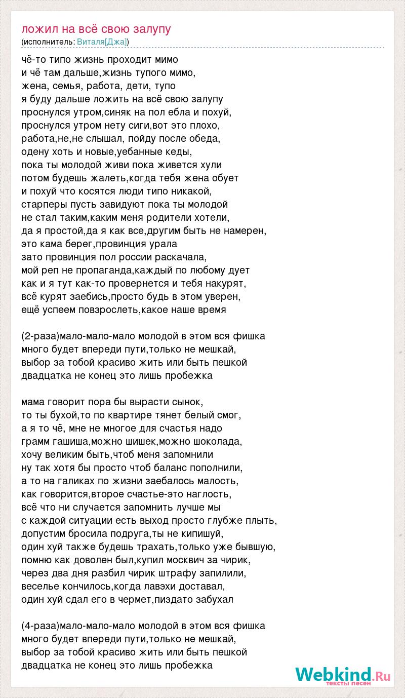 чё-то типо жизнь проходит мимо и чё там дальше,жизнь тупого мимо, жена, семья, работа, дети, тупо я буду дальше ложить на всё свою залупу проснулся утром,синяк на пол ебла и похуй, проснулся утром нету сиги,вот это плохо, работа,не,не слышал, пойду после обеда, одену хоть и новые,уебанные кеды, пока ты молодой живи пока живется хули потом будешь жалеть,когда тебя жена обует и похуй что косятся люди типо никакой, старперы пусть завидуют пока ты молодой не стал таким,каким меня родители хотели, да я простой,да я как все,другим быть не намерен, это кама берег,провинция урала зато провинция пол россии раскачала, мой реп не пропаганда,каждый по любому дует как и я тут как-то провернется и тебя накурят, всё курят заебись,просто будь в этом уверен, ещё успеем повзрослеть,какое наше время (2-раза)мало-мало-мало молодой в этом вся фишка много будет впереди пути,только не мешкай, выбор за тобой красиво жить или быть пешкой двадцатка не конец это лишь пробежка мама говорит пора бы вырасти сынок, то ты бухой,то по квартире тянет белый смог, а я то чё, мне не многое для счастья надо грамм гашиша,можно шишек,можно шоколада, хочу великим быть,чтоб меня запомнили ну так хотя бы просто чтоб баланс пополнили, а то на галиках по жизни заебалось малость, как говорится,второе счастье-это наглость, всё что ни случается запомнить лучше мы с каждой ситуации есть выход просто глубже плыть, допустим бросила подруга,ты не кипишуй, один хуй также будешь трахать,только уже бывшую, помню как доволен был,купил москвич за чирик, через два дня разбил чирик штрафу запилили, веселье кончилось,когда лавэхи доставал, один хуй сдал его в чермет,пиздато забухал (4-раза)мало-мало-мало молодой в этом вся фишка много будет впереди пути,только не мешкай, выбор за тобой красиво жить или быть пешкой двадцатка не конец это лишь пробежка