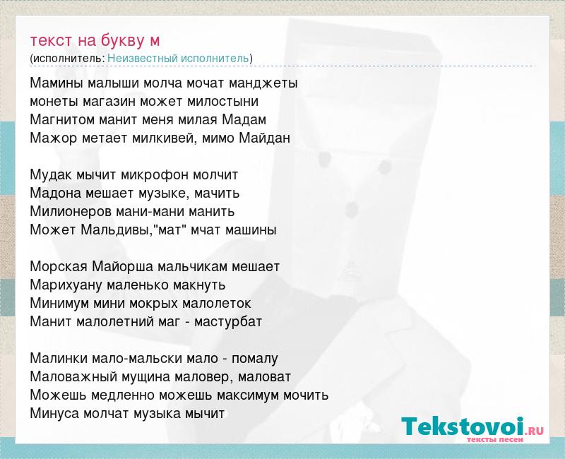 Мамины малыши молча мочат манджеты монеты магазин может милостыни Магнитом манит меня милая Мадам Мажор метает милкивей, мимо Майдан Мудак мычит микрофон молчит Мадона мешает музыке, мачить Милионеров мани-мани манить Может Мальдивы,"мат" мчат машины Морская Майорша мальчикам мешает Марихуану маленько макнуть Минимум мини мокрых малолеток Манит малолетний маг - мастурбат Малинки мало-мальски мало - помалу Маловажный мущина маловер, маловат Можешь медленно можешь максимум мочить Минуса молчат музыка мычит