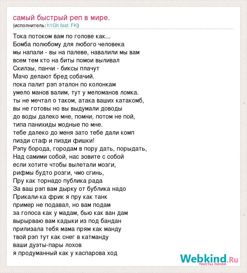 Тока потоком вам по голове как... Бомба полюбому для любого человека мы напали - вы на палеве, навалили мы вам всем тем кто на биты помои выливал Скилзы, панчи - биксы плачут Мачо делают бред собачий. пока палит рэп эталон по колонкам умело манов валим, тут у меломанов ломка. ты не мечтал о таком, атака ваших катакомб, вы не готовы но вы выдумали доводы до воды далеко мне, помни, потом не пой, типа панихиды модные по мне. тебе далеко до меня зато тебе дали комп пизди стаф и пизди фишки! Рэпу борода, городам в пору дать, порыдать, Над самими собой, нас зовите с собой если хотите чтобы вылетали мозги, рифмы будто розги, чмо сгинь, Пру как торнадо публика рада За ваш рэп вам дырку от бублика надо Прикали-ка фрик я пру как танк пример не подавал, но вам подам за голоса как у мадам, бью как ван дам вырырваю вам кадыки из под бандан прилизала тебя мама прям как манду твой рэп тут как снег в катманду ваши дуэты-пары лохов я продуманный как у каспарова ход