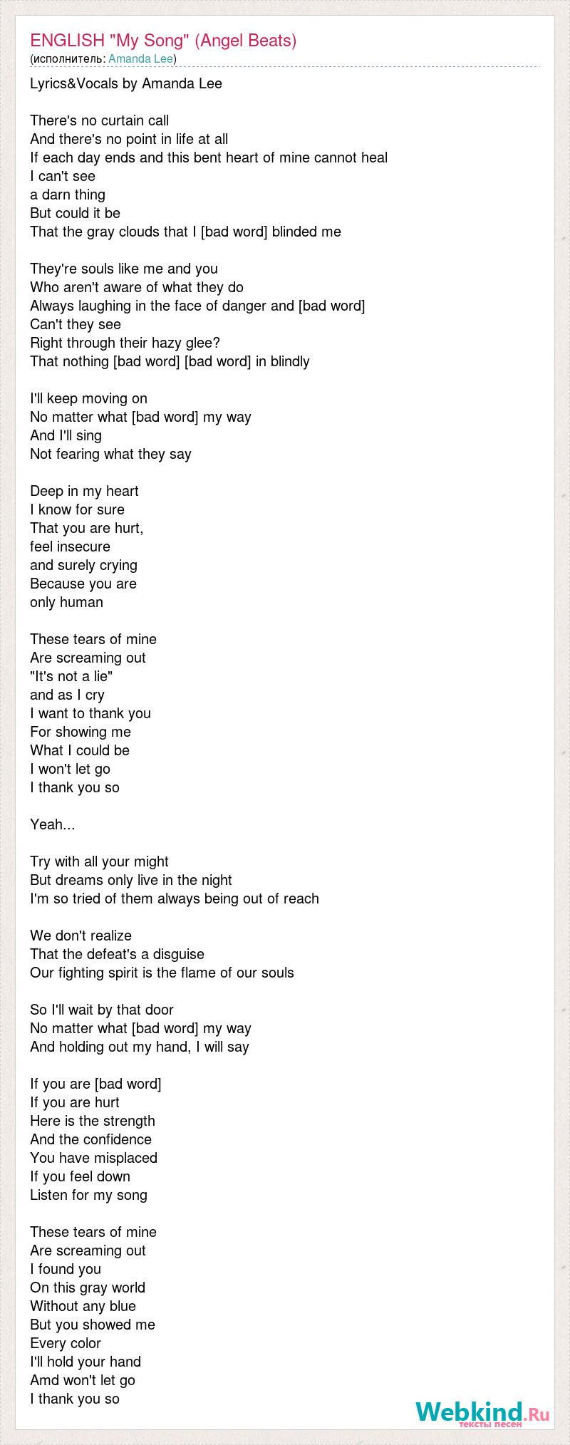 Lyrics&Vocals by Amanda Lee There's no curtain call And there's no point in life at all If each day ends and this bent heart of mine cannot heal I can't see a darn thing But could it be That the gray clouds that I [bad word] blinded me They're souls like me and you Who aren't aware of what they do Always laughing in the face of danger and [bad word] Can't they see Right through their hazy glee? That nothing [bad word] [bad word] in blindly I'll keep moving on No matter what [bad word] my way And I'll sing Not fearing what they say Deep in my heart I know for sure That you are hurt, feel insecure and surely crying Because you are only human These tears of mine Are screaming out "It's not a lie" and as I cry I want to thank you For showing me What I could be I won't let go I thank you so Yeah... Try with all your might But dreams only live in the night I'm so tried of them always being out of reach We don't realize That the defeat's a disguise Our fighting spirit is the flame of our souls So I'll wait by that door No matter what [bad word] my way And holding out my hand, I will say If you are [bad word] If you are hurt Here is the strength And the confidence You have misplaced If you feel down Listen for my song These tears of mine Are screaming out I found you On this gray world Without any blue But you showed me Every color I'll hold your hand Amd won't let go I thank you so