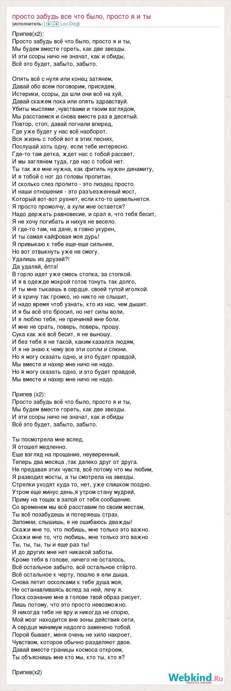 Припев(х2): Просто забудь всё что было, просто я и ты, Мы будем вместе гореть, как две звезды. И эти ссоры ничо не значат, как и обиды, Всё это будет, забыто, забыто. Опять всё с нуля или конец затянем, Давай обо всем поговорим, присядем. Истерики, ссоры, да шли они всё на хуй, Давай скажем пока или опять здравствуй. Убиты мыслями ,чувствами и твоим взглядом, Мы расстаемся и снова вместе раз в десятый. Повтор, стоп, давай погнали вперед, Где уже будет у нас всё наоборот. Вся жизнь с тобой вот в этих песнях, Послушай хоть одну, если тебе интересно. Где-то там детка, ждет нас с тобой рассвет, И мы заглянем туда, где нас с тобой нет. Ты так же мне нужна, как фитиль нужен динамиту, И я тобой с ног до головы пропитан. И сколько слез пролито - это пиздец просто. И наши отношения - это разъезженный мост, Который вот-вот рухнет, если кто-то шевельнется. Я просто промолчу, а хули мне остается? Надо держать равновесие, и срал я, что тебя бесит, Я не хочу погибать и нихуя не весело. Я где-то там, на даче, в говно укурен, И ты самая кайфовая моя дурь! Я привыкаю к тебе еще-еще сильнее, Но вот отвыкнуть уже не смогу. Удалишь из друзей?! Да удаляй, ёптэ! В горло идет уже смесь стопка, за стопкой. И я в одежде мокрой готов тонуть так долго, И ты мне тыкаешь в сердце. своей тупой иголкой. И я кричу так громко, но никто не слышит, И надо время чтоб узнать, кто из нас, чем дышит. И я бы всё это бросил, но нет силы воли, И я люблю тебя, не причиняй мне боли. И мне не срать, поверь, поверь, прошу. Сука как же всё бесит, я не выношу. И без тебя я не такой, каким казался людям, И я не знаю к чему все эти сопли и слюни. Но я могу сказать одно, и это будет правдой, Мы вместе и нахер мне ничо не надо. Но я могу сказать одно, и это будет правдой, Мы вместе и нахер мне ничо не надо. Припев (х2): Просто забудь всё что было, просто я и ты, Мы будем вместе гореть, как две звезды. И эти ссоры ничо не значат, как и обиды Всё это будет, забыто, забыто. Ты посмотрела мне вслед, Я отошел медленно. Еще взгляд на прощание, неуверенный, Теперь два месяца ,так далеко друг от друга. Не предавая этих чувств, всё потому что мы любим, Я разводил мосты, а ты смотрела на звезды. Стрелки уходят куда то, нет, уже слишком поздно. Утром еще минус день,я утром стану мудрей, Приму на тощак в запой от тебя сообщение. Со временем мы всё расставим по своим местам, Ты всё позабудешь и потеряешь страх. Запомни, слышишь, я не ошибаюсь дважды! Скажи мне то, что любишь, мне только это важно. Скажи мне то, что любишь, мне только это важно Ты, ты, ты, ты и еще раз ты! И до других мне нет никакой заботы. Кроме тебя в голове, ничего не осталось, Всё остальное забыто, всё остальное стёрто. Всё остальное к черту, пошлю я ели дыша. Снова летит осколками к тебе душа моя, Не останавливаясь вслед за ней, лечу я. Пока сознание мне в голове твой образ рисует, Лишь потому, что это просто невозможно. Я никогда тебе не вру и никогда не спорю, Мой мозг находится вне зоны действия сети, А сердце минимум надолго заменено тобой. Порой бывает, меня очень не хило накроет, Чувством, которое обычно разделяют двое. Давай вместе границы космоса откроем, Ты объяснишь мне кто мы, кто ты, кто я? Припев(х2)