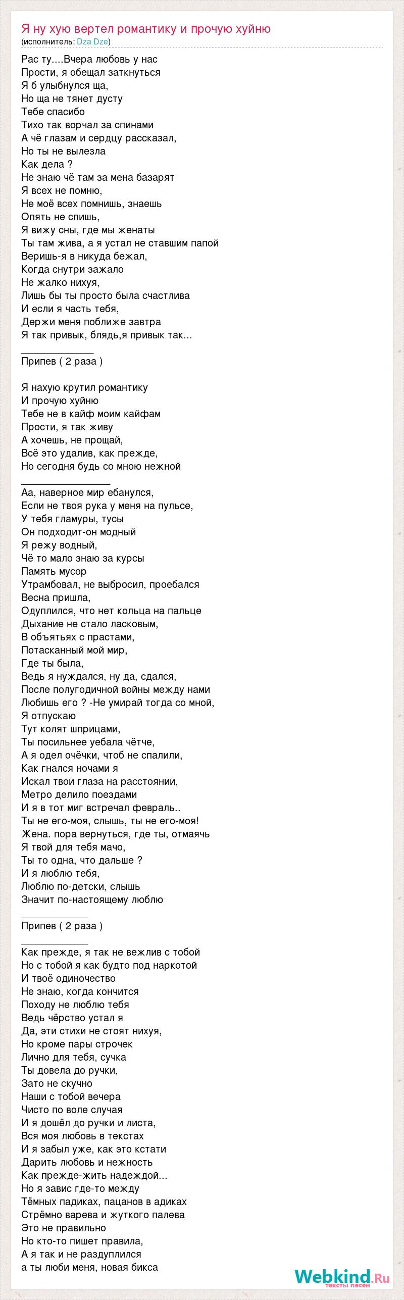 Рас ту....Вчера любовь у нас Прости, я обещал заткнуться Я б улыбнулся ща, Но ща не тянет дусту Тебе спасибо Тихо так ворчал за спинами А чё глазам и сердцу рассказал, Но ты не вылезла Как дела ? Не знаю чё там за мена базарят Я всех не помню, Не моё всех помнишь, знаешь Опять не спишь, Я вижу сны, где мы женаты Ты там жива, а я устал не ставшим папой Веришь-я в никуда бежал, Когда снутри зажало Не жалко нихуя, Лишь бы ты просто была счастлива И если я часть тебя, Держи меня поближе завтра Я так привык, блядь,я привык так... _____________ Припев ( 2 раза ) Я нахую крутил романтику И прочую хуйню Тебе не в кайф моим кайфам Прости, я так живу А хочешь, не прощай, Всё это удалив, как прежде, Но сегодня будь со мною нежной ________________ Аа, наверное мир ебанулся, Если не твоя рука у меня на пульсе, У тебя гламуры, тусы Он подходит-он модный Я режу водный, Чё то мало знаю за курсы Память мусор Утрамбовал, не выбросил, проебался Весна пришла, Одуплился, что нет кольца на пальце Дыхание не стало ласковым, В объятьях с прастами, Потасканный мой мир, Где ты была, Ведь я нуждался, ну да, сдался, После полугодичной войны между нами Любишь его ? -Не умирай тогда со мной, Я отпускаю Тут колят шприцами, Ты посильнее уебала чётче, А я одел очёчки, чтоб не спалили, Как гнался ночами я Искал твои глаза на расстоянии, Метро делило поездами И я в тот миг встречал февраль.. Ты не его-моя, слышь, ты не его-моя! Жена. пора вернуться, где ты, отмаячь Я твой для тебя мачо, Ты то одна, что дальше ? И я люблю тебя, Люблю по-детски, слышь Значит по-настоящему люблю ____________ Припев ( 2 раза ) ____________ Как прежде, я так не вежлив с тобой Но с тобой я как будто под наркотой И твоё одиночество Не знаю, когда кончится Походу не люблю тебя Ведь чёрство устал я Да, эти стихи не стоят нихуя, Но кроме пары строчек Лично для тебя, сучка Ты довела до ручки, Зато не скучно Наши с тобой вечера Чисто по воле случая И я дошёл до ручки и листа, Вся моя любовь в текстах И я забыл уже, как это кстати Дарить любовь и нежность Как прежде-жить надеждой... Но я завис где-то между Тёмных падиках, пацанов в адиках Стрёмно варева и жуткого палева Это не правильно Но кто-то пишет правила, А я так и не раздуплился а ты люби меня, новая бикса