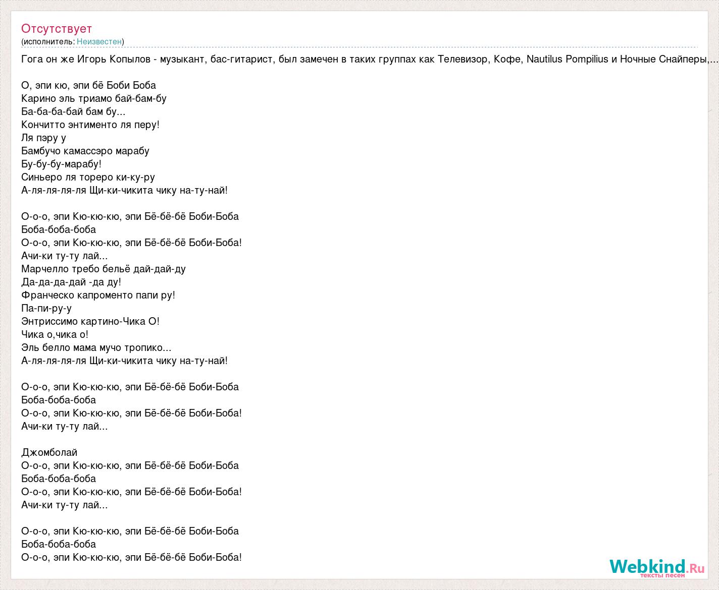 Гога он же Игорь Копылов - музыкант, бас-гитарист, был замечен в таких группах как Телевизор, Кофе, Nautilus Pompilius и Ночные Снайперы,... О, эпи кю, эпи бё Боби Боба Карино эль триамо бай-бам-бу Ба-ба-ба-бай бам бу... Кончитто энтименто ля перу! Ля пэру у Бамбучо камассэро марабу Бу-бу-бу-марабу! Синьеро ля тореро ки-ку-ру А-ля-ля-ля-ля Щи-ки-чикита чику на-ту-най! О-о-о, эпи Кю-кю-кю, эпи Бё-бё-бё Боби-Боба Боба-боба-боба О-о-о, эпи Кю-кю-кю, эпи Бё-бё-бё Боби-Боба! Ачи-ки ту-ту лай... Марчелло требо бельё дай-дай-ду Да-да-да-дай -да ду! Франческо капроменто папи ру! Па-пи-ру-у Энтриссимо картино-Чика О! Чика о,чика о! Эль белло мама мучо тропико... А-ля-ля-ля-ля Щи-ки-чикита чику на-ту-най! О-о-о, эпи Кю-кю-кю, эпи Бё-бё-бё Боби-Боба Боба-боба-боба О-о-о, эпи Кю-кю-кю, эпи Бё-бё-бё Боби-Боба! Ачи-ки ту-ту лай... Джомболай О-о-о, эпи Кю-кю-кю, эпи Бё-бё-бё Боби-Боба Боба-боба-боба О-о-о, эпи Кю-кю-кю, эпи Бё-бё-бё Боби-Боба! Ачи-ки ту-ту лай... О-о-о, эпи Кю-кю-кю, эпи Бё-бё-бё Боби-Боба Боба-боба-боба О-о-о, эпи Кю-кю-кю, эпи Бё-бё-бё Боби-Боба!