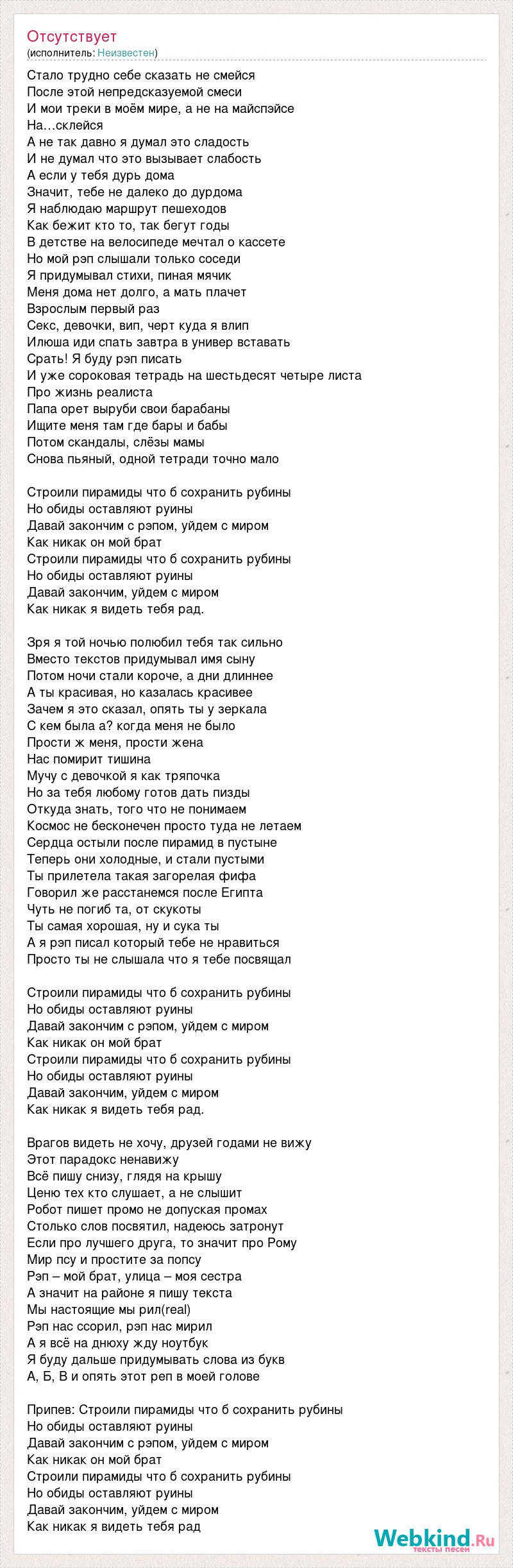 Стало трудно себе сказать не смейся После этой непредсказуемой смеси И мои треки в моём мире, а не на майспэйсе На…склейся А не так давно я думал это сладость И не думал что это вызывает слабость А если у тебя дурь дома Значит, тебе не далеко до дурдома Я наблюдаю маршрут пешеходов Как бежит кто то, так бегут годы В детстве на велосипеде мечтал о кассете Но мой рэп слышали только соседи Я придумывал стихи, пиная мячик Меня дома нет долго, а мать плачет Взрослым первый раз Секс, девочки, вип, черт куда я влип Илюша иди спать завтра в универ вставать Срать! Я буду рэп писать И уже сороковая тетрадь на шестьдесят четыре листа Про жизнь реалиста Папа орет выруби свои барабаны Ищите меня там где бары и бабы Потом скандалы, слёзы мамы Снова пьяный, одной тетради точно мало Строили пирамиды что б сохранить рубины Но обиды оставляют руины Давай закончим с рэпом, уйдем с миром Как никак он мой брат Строили пирамиды что б сохранить рубины Но обиды оставляют руины Давай закончим, уйдем с миром Как никак я видеть тебя рад. Зря я той ночью полюбил тебя так сильно Вместо текстов придумывал имя сыну Потом ночи стали короче, а дни длиннее А ты красивая, но казалась красивее Зачем я это сказал, опять ты у зеркала С кем была а? когда меня не было Прости ж меня, прости жена Нас помирит тишина Мучу с девочкой я как тряпочка Но за тебя любому готов дать пизды Откуда знать, того что не понимаем Космос не бесконечен просто туда не летаем Сердца остыли после пирамид в пустыне Теперь они холодные, и стали пустыми Ты прилетела такая загорелая фифа Говорил же расстанемся после Египта Чуть не погиб та, от скукоты Ты самая хорошая, ну и сука ты А я рэп писал который тебе не нравиться Просто ты не слышала что я тебе посвящал Строили пирамиды что б сохранить рубины Но обиды оставляют руины Давай закончим с рэпом, уйдем с миром Как никак он мой брат Строили пирамиды что б сохранить рубины Но обиды оставляют руины Давай закончим, уйдем с миром Как никак я видеть тебя рад. Врагов видеть не хочу, друзей годами не вижу Этот парадокс ненавижу Всё пишу снизу, глядя на крышу Ценю тех кто слушает, а не слышит Робот пишет промо не допуская промах Столько слов посвятил, надеюсь затронут Если про лучшего друга, то значит про Рому Мир псу и простите за попсу Рэп – мой брат, улица – моя сестра А значит на районе я пишу текста Мы настоящие мы рил(real) Рэп нас ссорил, рэп нас мирил А я всё на днюху жду ноутбук Я буду дальше придумывать слова из букв А, Б, В и опять этот реп в моей голове Припев: Строили пирамиды что б сохранить рубины Но обиды оставляют руины Давай закончим с рэпом, уйдем с миром Как никак он мой брат Строили пирамиды что б сохранить рубины Но обиды оставляют руины Давай закончим, уйдем с миром Как никак я видеть тебя рад