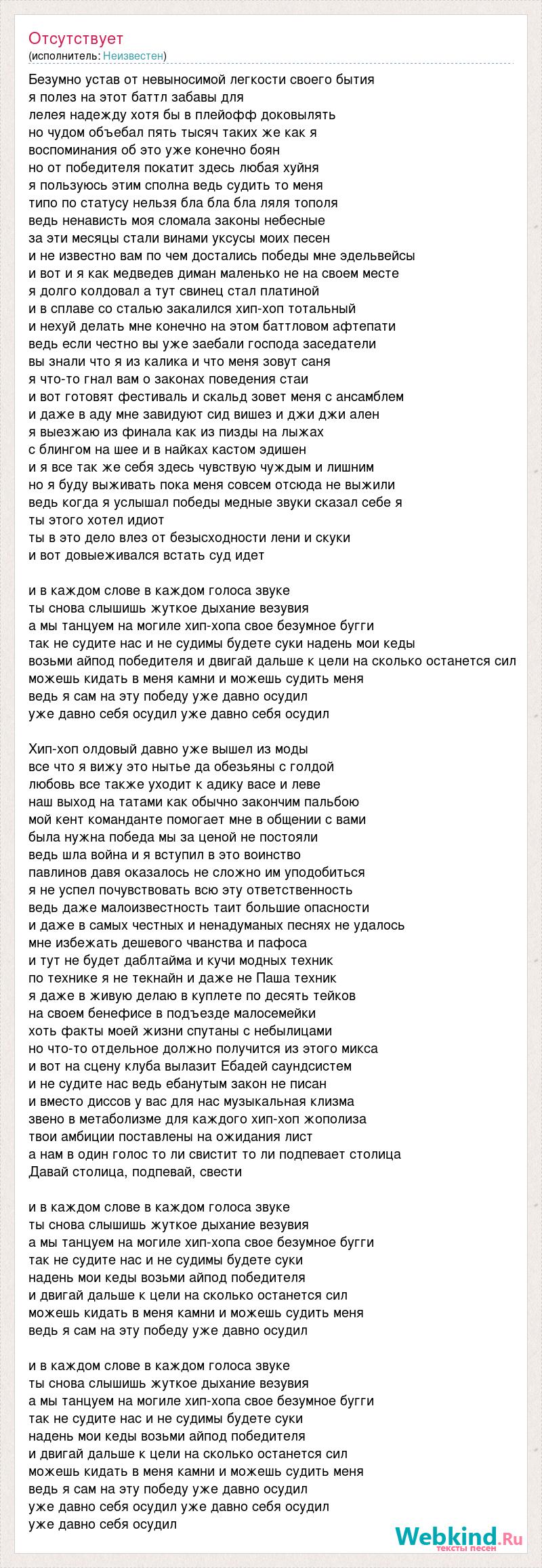 Безумно устав от невыносимой легкости своего бытия я полез на этот баттл забавы для лелея надежду хотя бы в плейофф доковылять но чудом объебал пять тысяч таких же как я воспоминания об это уже конечно боян но от победителя покатит здесь любая хуйня я пользуюсь этим сполна ведь судить то меня типо по статусу нельзя бла бла бла ляля тополя ведь ненависть моя сломала законы небесные за эти месяцы стали винами уксусы моих песен и не известно вам по чем достались победы мне эдельвейсы и вот и я как медведев диман маленько не на своем месте я долго колдовал а тут свинец стал платиной и в сплаве со сталью закалился хип-хоп тотальный и нехуй делать мне конечно на этом баттловом афтепати ведь если честно вы уже заебали господа заседатели вы знали что я из калика и что меня зовут саня я что-то гнал вам о законах поведения стаи и вот готовят фестиваль и скальд зовет меня с ансамблем и даже в аду мне завидуют сид вишез и джи джи ален я выезжаю из финала как из пизды на лыжах с блингом на шее и в найках кастом эдишен и я все так же себя здесь чувствую чуждым и лишним но я буду выживать пока меня совсем отсюда не выжили ведь когда я услышал победы медные звуки сказал себе я ты этого хотел идиот ты в это дело влез от безысходности лени и скуки и вот довыеживался встать суд идет и в каждом слове в каждом голоса звуке ты снова слышишь жуткое дыхание везувия а мы танцуем на могиле хип-хопа свое безумное бугги так не судите нас и не судимы будете суки надень мои кеды возьми айпод победителя и двигай дальше к цели на сколько останется сил можешь кидать в меня камни и можешь судить меня ведь я сам на эту победу уже давно осудил уже давно себя осудил уже давно себя осудил Хип-хоп олдовый давно уже вышел из моды все что я вижу это нытье да обезьяны с голдой любовь все также уходит к адику васе и леве наш выход на татами как обычно закончим пальбою мой кент команданте помогает мне в общении с вами была нужна победа мы за ценой не постояли ведь шла война и я вступил в это воинство павлинов давя оказалось не сложно им уподобиться я не успел почувствовать всю эту ответственность ведь даже малоизвестность таит большие опасности и даже в самых честных и ненадуманых песнях не удалось мне избежать дешевого чванства и пафоса и тут не будет даблтайма и кучи модных техник по технике я не текнайн и даже не Паша техник я даже в живую делаю в куплете по десять тейков на своем бенефисе в подъезде малосемейки хоть факты моей жизни спутаны с небылицами но что-то отдельное должно получится из этого микса и вот на сцену клуба вылазит Ебадей саундсистем и не судите нас ведь ебанутым закон не писан и вместо диссов у вас для нас музыкальная клизма звено в метаболизме для каждого хип-хоп жополиза твои амбиции поставлены на ожидания лист а нам в один голос то ли свистит то ли подпевает столица Давай столица, подпевай, свести и в каждом слове в каждом голоса звуке ты снова слышишь жуткое дыхание везувия а мы танцуем на могиле хип-хопа свое безумное бугги так не судите нас и не судимы будете суки надень мои кеды возьми айпод победителя и двигай дальше к цели на сколько останется сил можешь кидать в меня камни и можешь судить меня ведь я сам на эту победу уже давно осудил и в каждом слове в каждом голоса звуке ты снова слышишь жуткое дыхание везувия а мы танцуем на могиле хип-хопа свое безумн