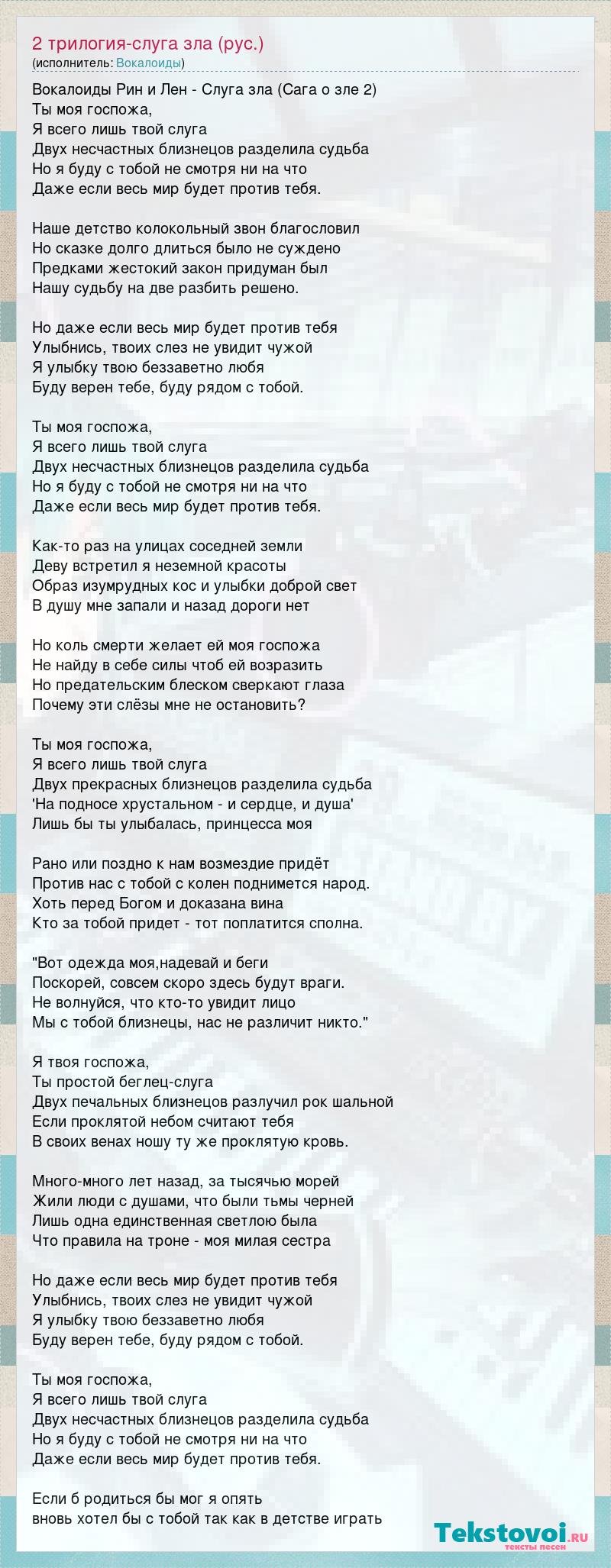 Вокалоиды Рин и Лен - Слуга зла (Сага о зле 2) Ты моя госпожа, Я всего лишь твой слуга Двух несчастных близнецов разделила судьба Но я буду с тобой не смотря ни на что Даже если весь мир будет против тебя. Наше детство колокольный звон благословил Но сказке долго длиться было не суждено Предками жестокий закон придуман был Нашу судьбу на две разбить решено. Но даже если весь мир будет против тебя Улыбнись, твоих слез не увидит чужой Я улыбку твою беззаветно любя Буду верен тебе, буду рядом с тобой. Ты моя госпожа, Я всего лишь твой слуга Двух несчастных близнецов разделила судьба Но я буду с тобой не смотря ни на что Даже если весь мир будет против тебя. Как-то раз на улицах соседней земли Деву встретил я неземной красоты Образ изумрудных кос и улыбки доброй свет В душу мне запали и назад дороги нет Но коль смерти желает ей моя госпожа Не найду в себе силы чтоб ей возразить Но предательским блеском сверкают глаза Почему эти слёзы мне не остановить? Ты моя госпожа, Я всего лишь твой слуга Двух прекрасных близнецов разделила судьба 'На подносе хрустальном - и сердце, и душа' Лишь бы ты улыбалась, принцесса моя Рано или поздно к нам возмездие придёт Против нас с тобой с колен поднимется народ. Хоть перед Богом и доказана вина Кто за тобой придет - тот поплатится сполна. "Вот одежда моя,надевай и беги Поскорей, совсем скоро здесь будут враги. Не волнуйся, что кто-то увидит лицо Мы с тобой близнецы, нас не различит никто." Я твоя госпожа, Ты простой беглец-слуга Двух печальных близнецов разлучил рок шальной Если проклятой небом считают тебя В своих венах ношу ту же проклятую кровь. Много-много лет назад, за тысячью морей Жили люди с душами, что были тьмы черней Лишь одна единственная светлою была Что правила на троне - моя милая сестра Но даже если весь мир будет против тебя Улыбнись, твоих слез не увидит чужой Я улыбку твою беззаветно любя Буду верен тебе, буду рядом с тобой. Ты моя госпожа, Я всего лишь твой слуга Двух несчастных близнецов разделила судьба Но я буду с тобой не смотря ни на что Даже если весь мир будет против тебя. Если б родиться бы мог я опять вновь хотел бы с тобой так как в детстве играть