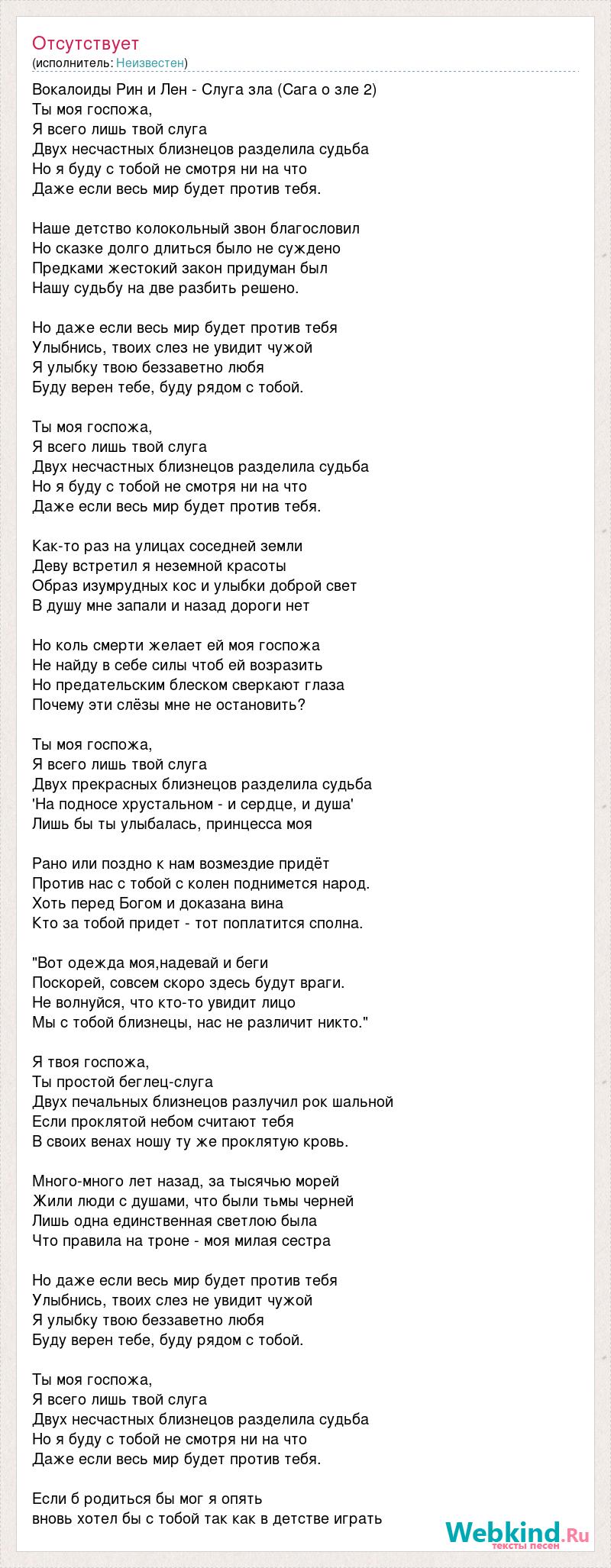 Вокалоиды Рин и Лен - Слуга зла (Сага о зле 2) Ты моя госпожа, Я всего лишь твой слуга Двух несчастных близнецов разделила судьба Но я буду с тобой не смотря ни на что Даже если весь мир будет против тебя. Наше детство колокольный звон благословил Но сказке долго длиться было не суждено Предками жестокий закон придуман был Нашу судьбу на две разбить решено. Но даже если весь мир будет против тебя Улыбнись, твоих слез не увидит чужой Я улыбку твою беззаветно любя Буду верен тебе, буду рядом с тобой. Ты моя госпожа, Я всего лишь твой слуга Двух несчастных близнецов разделила судьба Но я буду с тобой не смотря ни на что Даже если весь мир будет против тебя. Как-то раз на улицах соседней земли Деву встретил я неземной красоты Образ изумрудных кос и улыбки доброй свет В душу мне запали и назад дороги нет Но коль смерти желает ей моя госпожа Не найду в себе силы чтоб ей возразить Но предательским блеском сверкают глаза Почему эти слёзы мне не остановить? Ты моя госпожа, Я всего лишь твой слуга Двух прекрасных близнецов разделила судьба 'На подносе хрустальном - и сердце, и душа' Лишь бы ты улыбалась, принцесса моя Рано или поздно к нам возмездие придёт Против нас с тобой с колен поднимется народ. Хоть перед Богом и доказана вина Кто за тобой придет - тот поплатится сполна. "Вот одежда моя,надевай и беги Поскорей, совсем скоро здесь будут враги. Не волнуйся, что кто-то увидит лицо Мы с тобой близнецы, нас не различит никто." Я твоя госпожа, Ты простой беглец-слуга Двух печальных близнецов разлучил рок шальной Если проклятой небом считают тебя В своих венах ношу ту же проклятую кровь. Много-много лет назад, за тысячью морей Жили люди с душами, что были тьмы черней Лишь одна единственная светлою была Что правила на троне - моя милая сестра Но даже если весь мир будет против тебя Улыбнись, твоих слез не увидит чужой Я улыбку твою беззаветно любя Буду верен тебе, буду рядом с тобой. Ты моя госпожа, Я всего лишь твой слуга Двух несчастных близнецов разделила судьба Но я буду с тобой не смотря ни на что Даже если весь мир будет против тебя. Если б родиться бы мог я опять вновь хотел бы с тобой так как в детстве играть
