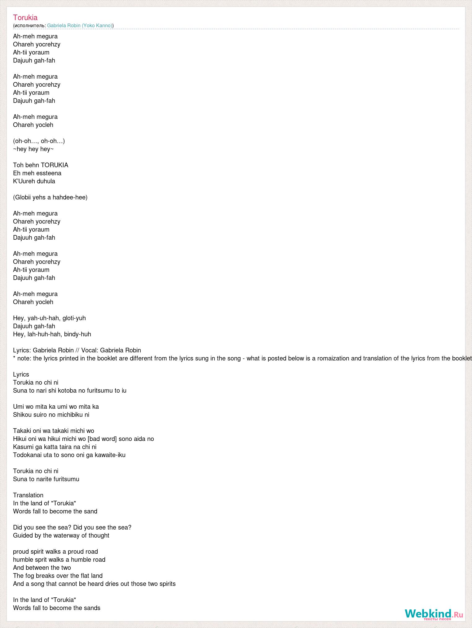 Ah-meh megura Ohareh yocrehzy Ah-tii yoraum Dajuuh gah-fah Ah-meh megura Ohareh yocrehzy Ah-tii yoraum Dajuuh gah-fah Ah-meh megura Ohareh yocleh (oh-oh…, oh-oh…) ~hey hey hey~ Toh behn TORUKIA Eh meh essteena K’Uureh duhula (Globii yehs a hahdee-hee) Ah-meh megura Ohareh yocrehzy Ah-tii yoraum Dajuuh gah-fah Ah-meh megura Ohareh yocrehzy Ah-tii yoraum Dajuuh gah-fah Ah-meh megura Ohareh yocleh Hey, yah-uh-hah, gloti-yuh Dajuuh gah-fah Hey, lah-huh-hah, bindy-huh Lyrics: Gabriela Robin // Vocal: Gabriela Robin * note: the lyrics printed in the booklet are different from the lyrics sung in the song - what is posted below is a romaization and translation of the lyrics from the booklet Lyrics Torukia no chi ni Suna to nari shi kotoba no furitsumu to iu Umi wo mita ka umi wo mita ka Shikou suiro no michibiku ni Takaki oni wa takaki michi wo Hikui oni wa hikui michi wo [bad word] sono aida no Kasumi ga katta taira na chi ni Todokanai uta to sono oni ga kawaite-iku Torukia no chi ni Suna to narite furitsumu Translation In the land of "Torukia" Words fall to become the sand Did you see the sea? Did you see the sea? Guided by the waterway of thought proud spirit walks a proud road humble sprit walks a humble road And between the two The fog breaks over the flat land And a song that cannot be heard dries out those two spirits In the land of "Torukia" Words fall to become the sands