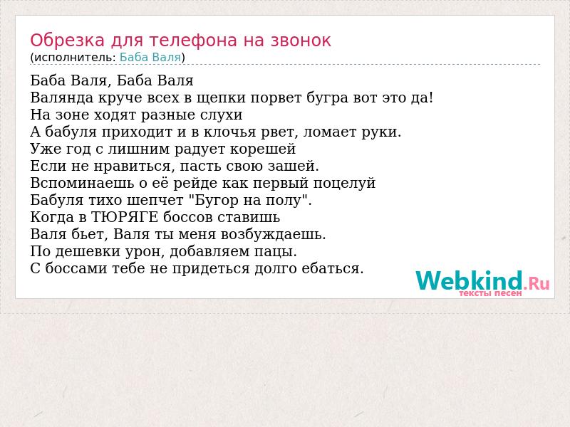 Баба Валя, Баба Валя Валянда круче всех в щепки порвет бугра вот это да! На зоне ходят разные слухи А бабуля приходит и в клочья рвет, ломает руки. Уже год с лишним радует корешей Если не нравиться, пасть свою зашей. Вспоминаешь о её рейде как первый поцелуй Бабуля тихо шепчет "Бугор на полу". Когда в ТЮРЯГЕ боссов ставишь Валя бьет, Валя ты меня возбуждаешь. По дешевки урон, добавляем пацы. С боссами тебе не придеться долго ебаться.