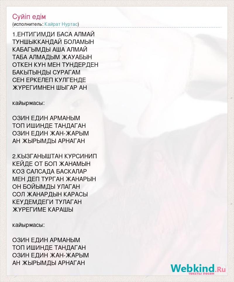 1.ЕНТИГИМДИ БАСА АЛМАЙ ТУНШЫККАНДАЙ БОЛАМЫН КАБАГЫМДЫ АША АЛМАЙ ТАБА АЛМАДЫМ ЖАУАБЫН ОТКЕН КУН МЕН ТУНДЕРДЕН БАКЫТЫНДЫ СУРАГАМ СЕН ЕРКЕЛЕП КУЛГЕНДЕ ЖУРЕГИМНЕН ШЫГАР АН кайырмасы: ОЗИН ЕДИН АРМАНЫМ ТОП ИШИНДЕ ТАНДАГАН ОЗИН ЕДИН ЖАН-ЖАРЫМ АН ЖЫРЫМДЫ АРНАГАН 2.КЫЗГАНЫШТАН КУРСИНИП КЕЙДЕ ОТ БОП ЖАНАМЫН КОЗ САЛСАДА БАСКАЛАР МЕН ДЕП ТУРГАН ЖАНАРЫН ОН БОЙЫМДЫ УЛАГАН СОЛ ЖАНАРДЫН КАРАСЫ КЕУДЕМДЕГИ ТУЛАГАН ЖУРЕГИМЕ КАРАШЫ кайырмасы: ОЗИН ЕДИН АРМАНЫМ ТОП ИШИНДЕ ТАНДАГАН ОЗИН ЕДИН ЖАН-ЖАРЫМ АН ЖЫРЫМДЫ АРНАГАН