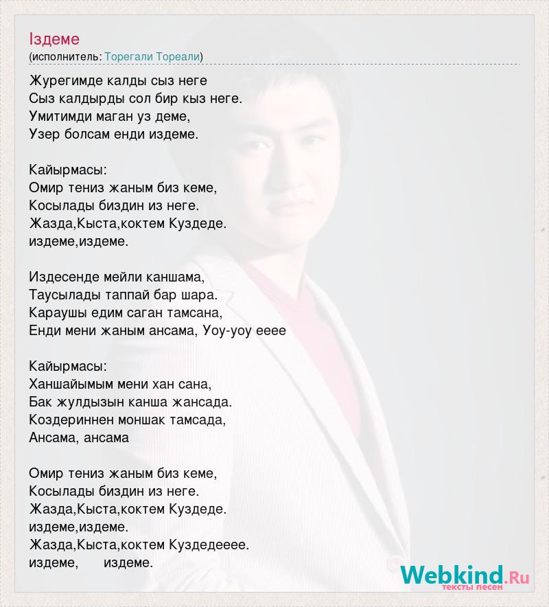 Журегимде калды сыз неге Сыз калдырды сол бир кыз неге. Умитимди маган уз деме, Узер болсам енди издеме. Кайырмасы: Омир тениз жаным биз кеме, Косылады биздин из неге. Жазда,Кыста,коктем Куздеде. издеме,издеме. Издесенде мейли каншама, Таусылады таппай бар шара. Караушы едим саган тамсана, Енди мени жаным ансама, Уоу-уоу ееее Кайырмасы: Ханшайымым мени хан сана, Бак жулдызын канша жансада. Коздериннен моншак тамсада, Ансама, ансама Омир тениз жаным биз кеме, Косылады биздин из неге. Жазда,Кыста,коктем Куздеде. издеме,издеме. Жазда,Кыста,коктем Куздедееее. издеме, издеме.