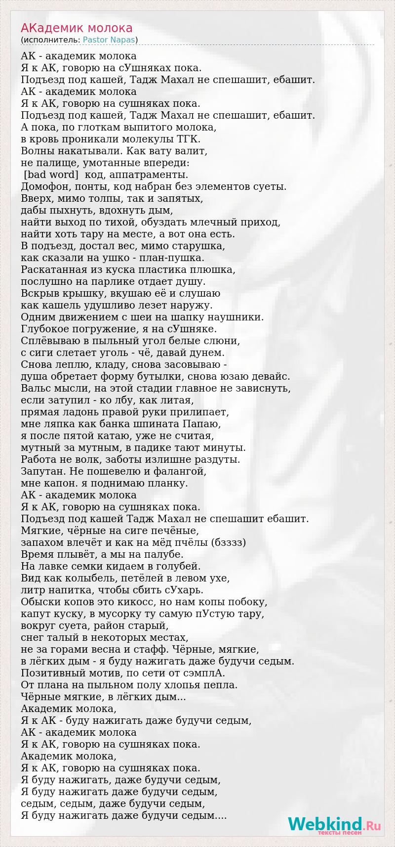 АК - академик молока Я к АК, говорю на сУшняках пока. Подъезд под кашей, Тадж Махал не спешашит, ебашит. АК - академик молока Я к АК, говорю на сушняках пока. Подъезд под кашей, Тадж Махал не спешашит, ебашит. А пока, по глоткам выпитого молока, в кровь проникали молекулы ТГК. Волны накатывали. Как вату валит, не палище, умотанные впереди: [bad word] код, аппатраменты. Домофон, понты, код набран без элементов суеты. Вверх, мимо толпы, так и запятых, дабы пыхнуть, вдохнуть дым, найти выход по тихой, обуздать млечный приход, найти хоть тару на месте, а вот она есть. В подъезд, достал вес, мимо старушка, как сказали на ушко - план-пушка. Раскатанная из куска пластика плюшка, послушно на парлике отдает душу. Вскрыв крышку, вкушаю её и слушаю как кашель удушливо лезет наружу. Одним движением с шеи на шапку наушники. Глубокое погружение, я на сУшняке. Сплёвываю в пыльный угол белые слюни, с сиги слетает уголь - чё, давай дунем. Снова леплю, кладу, снова засовываю - душа обретает форму бутылки, снова юзаю девайс. Вальс мысли, на этой стадии главное не зависнуть, если затупил - ко лбу, как литая, прямая ладонь правой руки прилипает, мне ляпка как банка шпината Папаю, я после пятой катаю, уже не считая, мутный за мутным, в падике тают минуты. Работа не волк, заботы излишне раздуты. Запутан. Не пошевелю и фалангой, мне капон. я поднимаю планку. АК - академик молока Я к АК, говорю на сушняках пока. Подъезд под кашей Тадж Махал не спешашит ебашит. Мягкие, чёрные на сиге печёные, запахом влечёт и как на мёд пчёлы (бзззз) Время плывёт, а мы на палубе. На лавке семки кидаем в голубей. Вид как колыбель, петёлей в левом ухе, литр напитка, чтобы сбить сУхарь. Обыски копов это кикосс, но нам копы побоку, капут куску, в мусорку ту самую пУстую тару, вокруг суета, район старый, снег талый в некоторых местах, не за горами весна и стафф. Чёрные, мягкие, в лёгких дым - я буду нажигать даже будучи седым. Позитивный мотив, по сети от сэмплА. От плана на пыльном полу хлопья пепла. Чёрные мягкие, в лёгких дым... Академик молока, Я к АК - буду нажигать даже будучи седым, АК - академик молока Я к АК, говорю на сушняках пока. Академик молока, Я к АК, говорю на сушняках пока. Я буду нажигать, даже будучи седым, Я буду нажигать даже будучи седым, седым, седым, даже будучи седым, Я буду нажигать даже будучи седым....