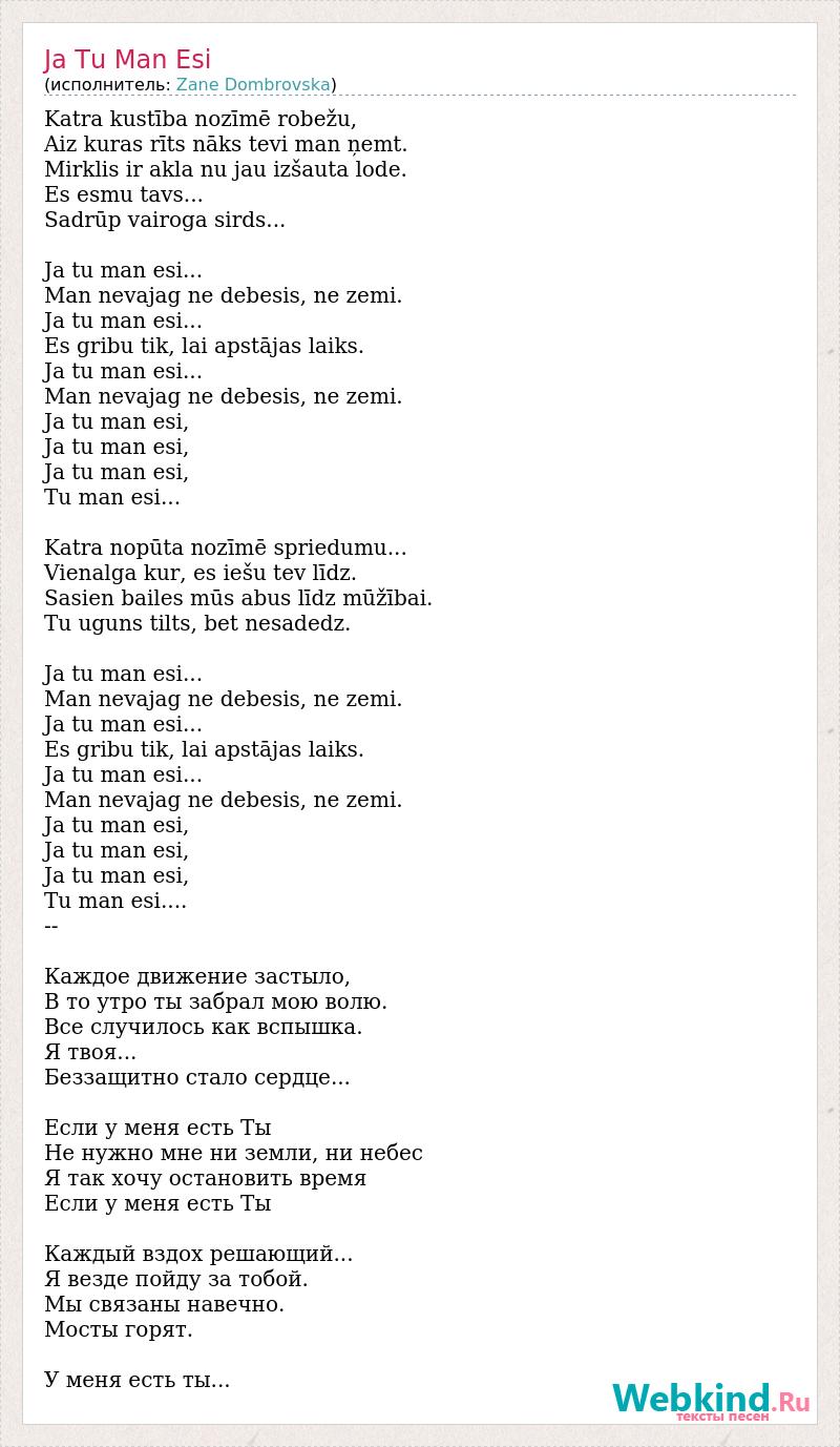 Katra kustība nozīmē robežu, Aiz kuras rīts nāks tevi man ņemt. Mirklis ir akla nu jau izšauta lode. Es esmu tavs... Sadrūp vairoga sirds... Ja tu man esi... Man nevajag ne debesis, ne zemi. Ja tu man esi... Es gribu tik, lai apstājas laiks. Ja tu man esi... Man nevajag ne debesis, ne zemi. Ja tu man esi, Ja tu man esi, Ja tu man esi, Tu man esi... Katra nopūta nozīmē spriedumu... Vienalga kur, es iešu tev līdz. Sasien bailes mūs abus līdz mūžībai. Tu uguns tilts, bet nesadedz. Ja tu man esi... Man nevajag ne debesis, ne zemi. Ja tu man esi... Es gribu tik, lai apstājas laiks. Ja tu man esi... Man nevajag ne debesis, ne zemi. Ja tu man esi, Ja tu man esi, Ja tu man esi, Tu man esi.... -- Каждое движение застыло, В то утро ты забрал мою волю. Все случилось как вспышка. Я твоя... Беззащитно стало сердце... Если у меня есть Ты Не нужно мне ни земли, ни небес Я так хочу остановить время Если у меня есть Ты Каждый вздох решающий... Я везде пойду за тобой. Мы связаны навечно. Мосты горят. У меня есть ты...