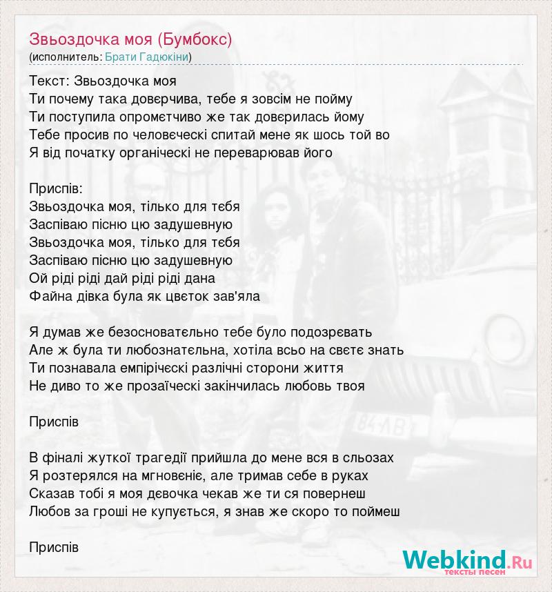 Текст: Звьоздочка моя Ти почему така довєрчива, тебе я зовсім не пойму Ти поступила опромєтчиво же так довєрилась йому Тебе просив по человєческі спитай мене як шось той во Я від початку органіческі не переварював його Приспів: Звьоздочка моя, тілько для тєбя Заспіваю пісню цю задушевную Звьоздочка моя, тілько для тєбя Заспіваю пісню цю задушевную Ой ріді ріді дай ріді ріді дана Файна дівка була як цвєток зав'яла Я думав же безосноватєльно тебе було подозрєвать Але ж була ти любознатєльна, хотіла всьо на свєтє знать Ти познавала емпірічєскі разлічні сторони життя Hе диво то же прозаїческі закінчилась любовь твоя Приспів В фіналі жуткої трагедії прийшла до мене вся в сльозах Я розтерялся на мгновєніє, але тримав себе в руках Сказав тобі я моя дєвочка чекав же ти ся повернеш Любов за гроші не купується, я знав же скоро то поймеш Приспів