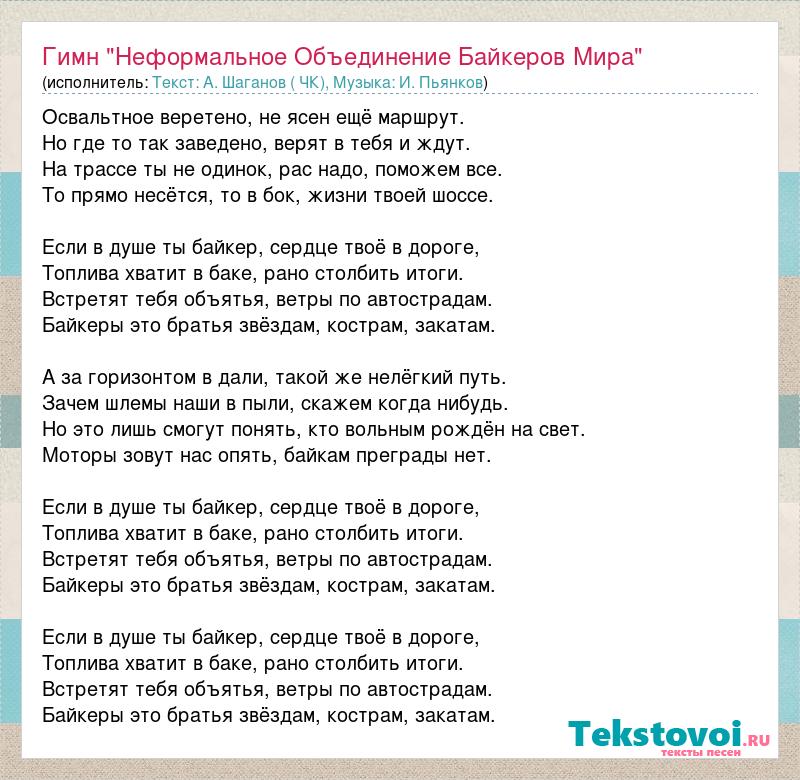 Главная→Исполнители→Текст: А. Шаганов ( ЧК), Музыка: И. Пьянков→Гимн "Неформальное Объединение Байкеров Мира"