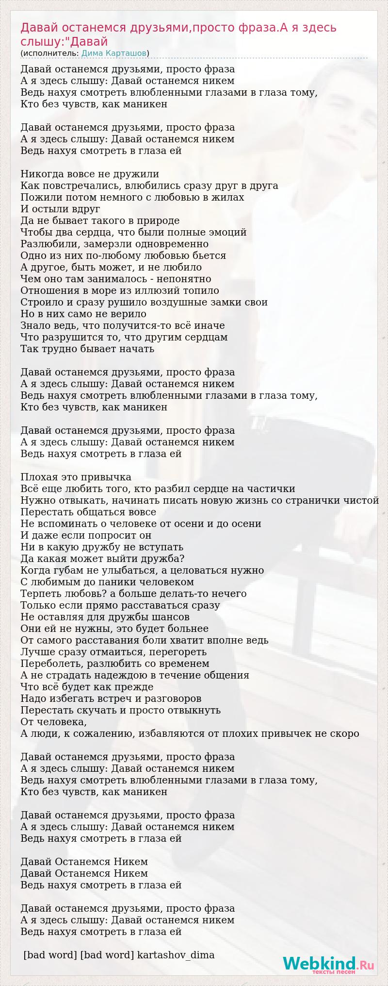Давай останемся друзьями, просто фраза А я здесь слышу: Давай останемся никем Ведь нахуя смотреть влюбленными глазами в глаза тому, Кто без чувств, как маникен Давай останемся друзьями, просто фраза А я здесь слышу: Давай останемся никем Ведь нахуя смотреть в глаза ей Никогда вовсе не дружили Как повстречались, влюбились сразу друг в друга Пожили потом немного с любовью в жилах И остыли вдруг Да не бывает такого в природе Чтобы два сердца, что были полные эмоций Разлюбили, замерзли одновременно Одно из них по-любому любовью бьется А другое, быть может, и не любило Чем оно там занималось - непонятно Отношения в море из иллюзий топило Строило и сразу рушило воздушные замки свои Но в них само не верило Знало ведь, что получится-то всё иначе Что разрушится то, что другим сердцам Так трудно бывает начать Давай останемся друзьями, просто фраза А я здесь слышу: Давай останемся никем Ведь нахуя смотреть влюбленными глазами в глаза тому, Кто без чувств, как маникен Давай останемся друзьями, просто фраза А я здесь слышу: Давай останемся никем Ведь нахуя смотреть в глаза ей Плохая это привычка Всё еще любить того, кто разбил сердце на частички Нужно отвыкать, начинать писать новую жизнь со странички чистой Перестать общаться вовсе Не вспоминать о человеке от осени и до осени И даже если попросит он Ни в какую дружбу не вступать Да какая может выйти дружба? Когда губам не улыбаться, а целоваться нужно С любимым до паники человеком Терпеть любовь? а больше делать-то нечего Только если прямо расставаться сразу Не оставляя для дружбы шансов Они ей не нужны, это будет больнее От самого расставания боли хватит вполне ведь Лучше сразу отмаиться, перегореть Переболеть, разлюбить со временем А не страдать надеждою в течение общения Что всё будет как прежде Надо избегать встреч и разговоров Перестать скучать и просто отвыкнуть От человека, А люди, к сожалению, избавляются от плохих привычек не скоро Давай останемся друзьями, просто фраза А я здесь слышу: Давай останемся никем Ведь нахуя смотреть влюбленными глазами в глаза тому, Кто без чувств, как маникен Давай останемся друзьями, просто фраза А я здесь слышу: Давай останемся никем Ведь нахуя смотреть в глаза ей Давай Останемся Никем Давай Останемся Никем Ведь нахуя смотреть в глаза ей Давай останемся друзьями, просто фраза А я здесь слышу: Давай останемся никем Ведь нахуя смотреть в глаза ей [bad word] [bad word] kartashov_dima