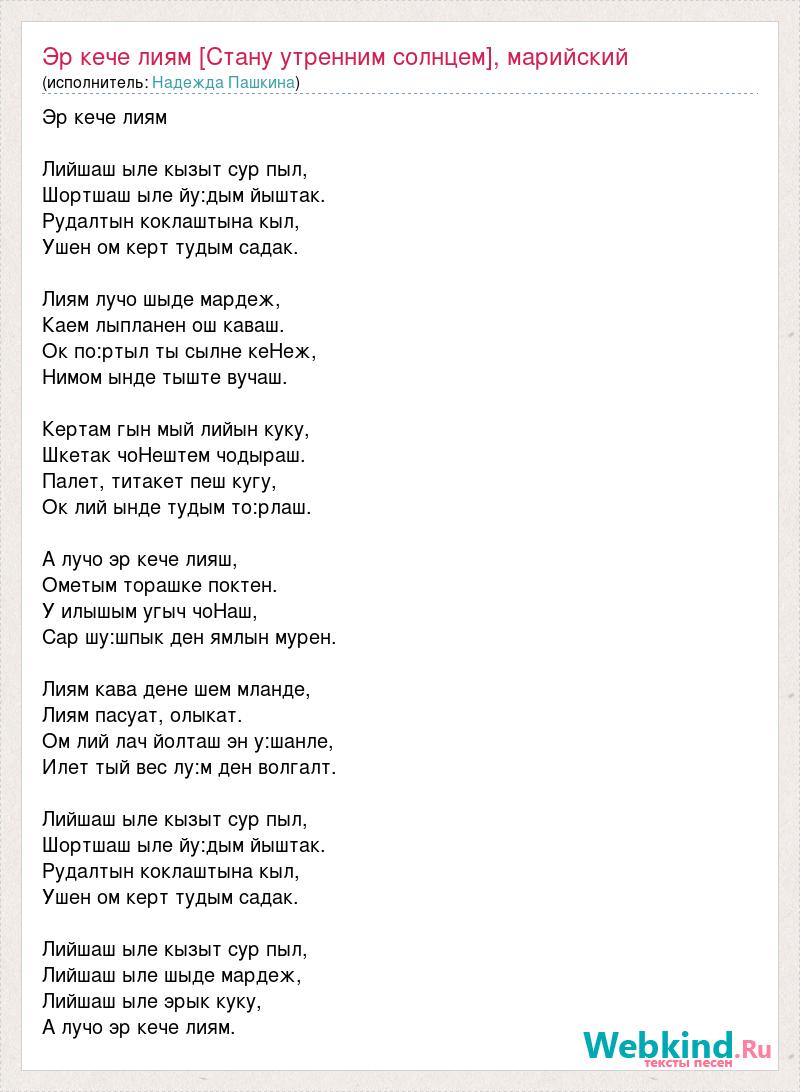 Эр кече лиям Лийшаш ыле кызыт сур пыл, Шортшаш ыле йу:дым йыштак. Рудалтын коклаштына кыл, Ушен ом керт тудым садак. Лиям лучо шыде мардеж, Каем лыпланен ош каваш. Ок по:ртыл ты сылне кеНеж, Нимом ынде тыште вучаш. Кертам гын мый лийын куку, Шкетак чоНештем чодыраш. Палет, титакет пеш кугу, Ок лий ынде тудым то:рлаш. А лучо эр кече лияш, Ометым торашке поктен. У илышым угыч чоНаш, Сар шу:шпык ден ямлын мурен. Лиям кава дене шем мланде, Лиям пасуат, олыкат. Ом лий лач йолташ эн у:шанле, Илет тый вес лу:м ден волгалт. Лийшаш ыле кызыт сур пыл, Шортшаш ыле йу:дым йыштак. Рудалтын коклаштына кыл, Ушен ом керт тудым садак. Лийшаш ыле кызыт сур пыл, Лийшаш ыле шыде мардеж, Лийшаш ыле эрык куку, А лучо эр кече лиям.
