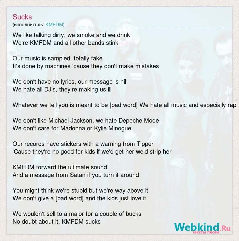 We like talking dirty, we smoke and we drink We're KMFDM and all other bands stink Our music is sampled, totally fake It's done by machines 'cause they don't make mistakes We don't have no lyrics, our message is nil We hate all DJ's, they're making us ill Whatever we tell you is meant to be [bad word] We hate all music and especially rap We don't like Michael Jackson, we hate Depeche Mode We don't care for Madonna or Kylie Minogue Our records have stickers with a warning from Tipper 'Cause they're no good for kids if we'd get her we'd strip her KMFDM forward the ultimate sound And a message from Satan if you turn it around You might think we're stupid but we're way above it We don't give a [bad word] and the kids just love it We wouldn't sell to a major for a couple of bucks No doubt about it, KMFDM sucks
