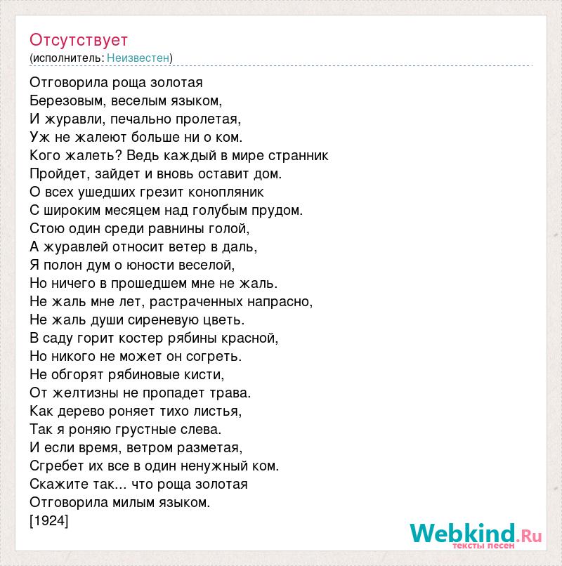 Отговорила роща золотая Березовым, веселым языком, И журавли, печально пролетая, Уж не жалеют больше ни о ком. Кого жалеть? Ведь каждый в мире странник Пройдет, зайдет и вновь оставит дом. О всех ушедших грезит конопляник С широким месяцем над голубым прудом. Стою один среди равнины голой, А журавлей относит ветер в даль, Я полон дум о юности веселой, Но ничего в прошедшем мне не жаль. Не жаль мне лет, растраченных напрасно, Не жаль души сиреневую цветь. В саду горит костер рябины красной, Но никого не может он согреть. Не обгорят рябиновые кисти, От желтизны не пропадет трава. Как дерево роняет тихо листья, Так я роняю грустные слева. И если время, ветром разметая, Сгребет их все в один ненужный ком. Скажите так... что роща золотая Отговорила милым языком. [1924]