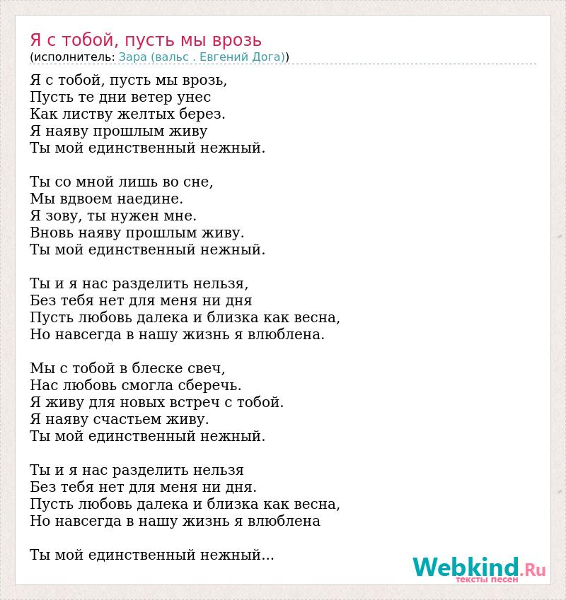 Я с тобой, пусть мы врозь, Пусть те дни ветер унес Как листву желтых берез. Я наяву прошлым живу Ты мой единственный нежный. Ты со мной лишь во сне, Мы вдвоем наедине. Я зову, ты нужен мне. Вновь наяву прошлым живу. Ты мой единственный нежный. Ты и я нас разделить нельзя, Без тебя нет для меня ни дня Пусть любовь далека и близка как весна, Но навсегда в нашу жизнь я влюблена. Мы с тобой в блеске свеч, Нас любовь смогла сберечь. Я живу для новых встреч с тобой. Я наяву счастьем живу. Ты мой единственный нежный. Ты и я нас разделить нельзя Без тебя нет для меня ни дня. Пусть любовь далека и близка как весна, Но навсегда в нашу жизнь я влюблена Ты мой единственный нежный...