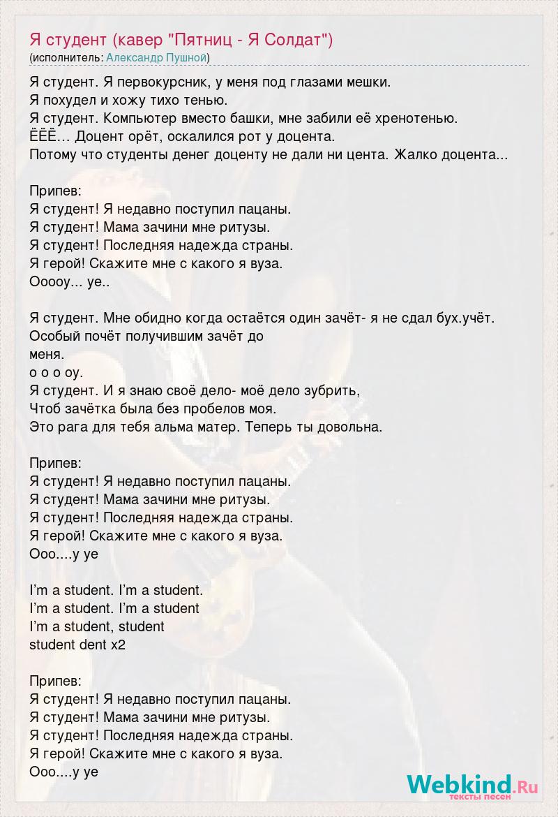 Я студент. Я первокурсник, у меня под глазами мешки. Я похудел и хожу тихо тенью. Я студент. Компьютер вместо башки, мне забили её хренотенью. ЁЁЁ… Доцент орёт, оскалился рот у доцента. Потому что студенты денег доценту не дали ни цента. Жалко доцента... Припев: Я студент! Я недавно поступил пацаны. Я студент! Мама зачини мне ритузы. Я студент! Последняя надежда страны. Я герой! Скажите мне с какого я вуза. Ооооу... уе.. Я студент. Мне обидно когда остаётся один зачёт- я не сдал бух.учёт. Особый почёт получившим зачёт до меня. о о о оу. Я студент. И я знаю своё дело- моё дело зубрить, Чтоб зачётка была без пробелов моя. Это рага для тебя альма матер. Теперь ты довольна. Припев: Я студент! Я недавно поступил пацаны. Я студент! Мама зачини мне ритузы. Я студент! Последняя надежда страны. Я герой! Скажите мне с какого я вуза. Ооо....у уе I’m a student. I’m a student. I’m a student. I’m a student I’m a student, student student dent х2 Припев: Я студент! Я недавно поступил пацаны. Я студент! Мама зачини мне ритузы. Я студент! Последняя надежда страны. Я герой! Скажите мне с какого я вуза. Ооо....у уе
