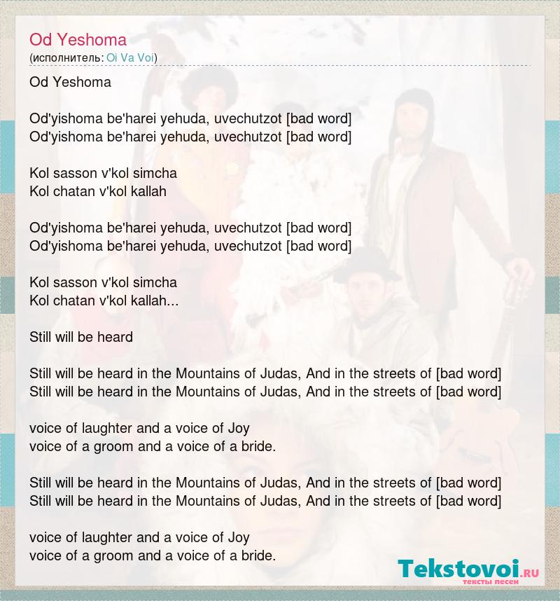 Od Yeshoma Od'yishoma be'harei yehuda, uvechutzot [bad word] Od'yishoma be'harei yehuda, uvechutzot [bad word] Kol sasson v'kol simcha Kol chatan v'kol kallah Od'yishoma be'harei yehuda, uvechutzot [bad word] Od'yishoma be'harei yehuda, uvechutzot [bad word] Kol sasson v'kol simcha Kol chatan v'kol kallah... Still will be heard Still will be heard in the Mountains of Judas, And in the streets of [bad word] Still will be heard in the Mountains of Judas, And in the streets of [bad word] voice of laughter and a voice of Joy voice of a groom and a voice of a bride. Still will be heard in the Mountains of Judas, And in the streets of [bad word] Still will be heard in the Mountains of Judas, And in the streets of [bad word] voice of laughter and a voice of Joy voice of a groom and a voice of a bride.
