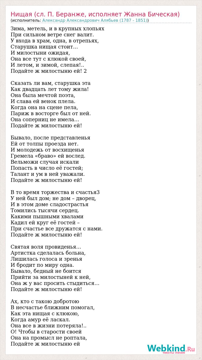 Главная→Исполнители→Александр Александрович Алябьев (1787 - 1851)→Нищая (сл. П. Беранже, исполняет Жанна Бическая)
