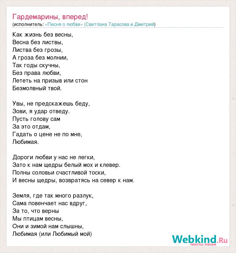Как жизнь без весны, Весна без листвы, Листва без грозы, А гроза без молнии, Так годы скучны, Без права любви, Лететь на призыв или стон Безмолвный твой. Увы, не предскажешь беду, Зови, я удар отведу. Пусть голову сам За это отдам, Гадать о цене не по мне, Любимая. Дороги любви у нас не легки, Зато к нам щедры белый мох и клевер. Полны соловьи счастливой тоски, И весны щедры, возвратясь на север к нам. Земля, где так много разлук, Сама повенчает нас вдруг, За то, что верны Мы птицам весны, Они и зимой нам слышны, Любимая (или Любимый мой)