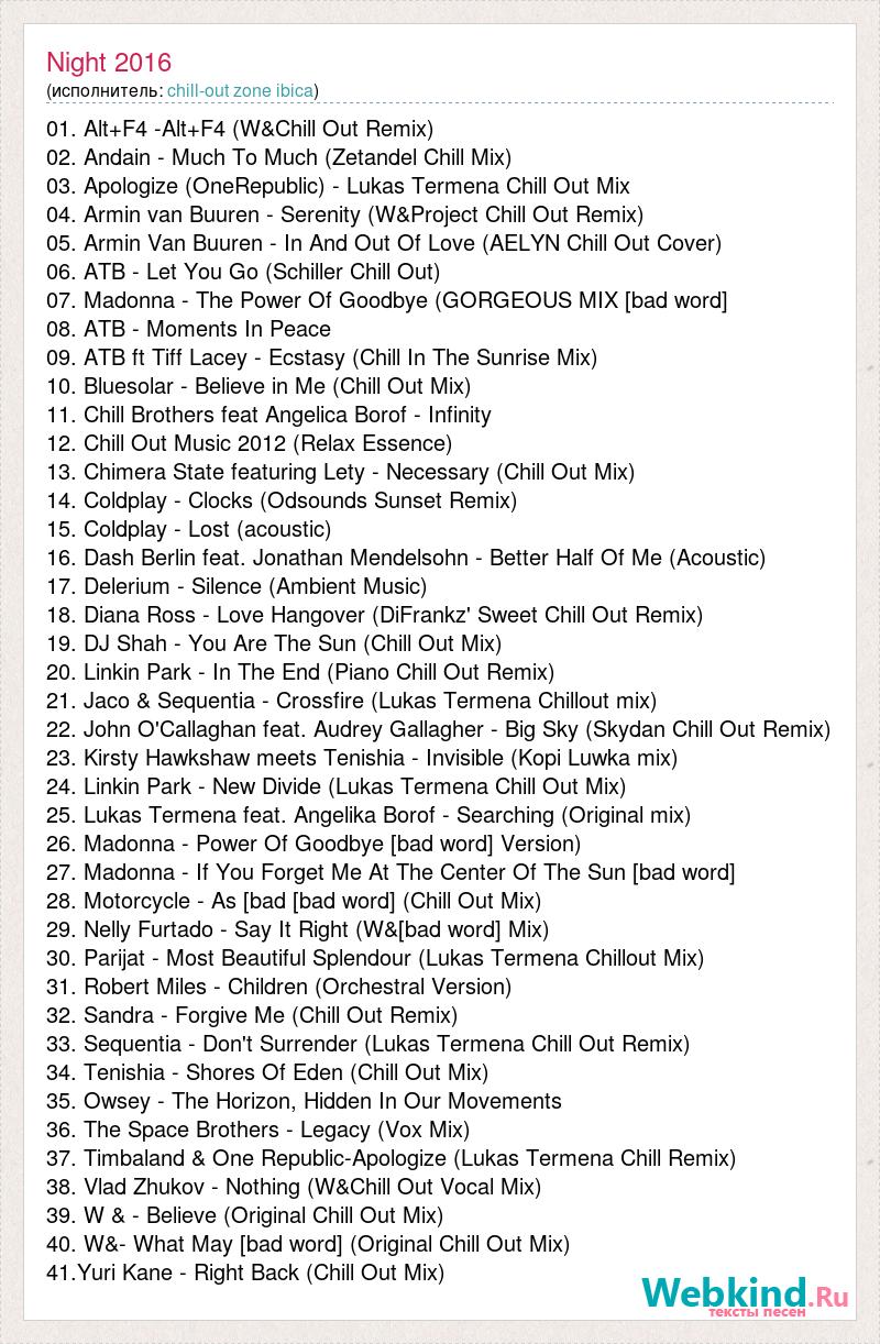 01. Alt+F4 -Alt+F4 (W&Chill Out Remix) 02. Andain - Much To Much (Zetandel Chill Mix) 03. Apologize (OneRepublic) - Lukas Termena Chill Out Mix 04. Armin van Buuren - Serenity (W&Project Chill Out Remix) 05. Armin Van Buuren - In And Out Of Love (AELYN Chill Out Cover) 06. ATB - Let You Go (Schiller Chill Out) 07. Madonna - The Power Of Goodbye (GORGEOUS MIX [bad word] 08. ATB - Moments In Peace 09. ATB ft Tiff Lacey - Ecstasy (Chill In The Sunrise Mix) 10. Bluesolar - Believe in Me (Chill Out Mix) 11. Chill Brothers feat Angelica Borof - Infinity 12. Chill Out Music 2012 (Relax Essence) 13. Chimera State featuring Lety - Necessary (Chill Out Mix) 14. Coldplay - Clocks (Odsounds Sunset Remix) 15. Coldplay - Lost (acoustic) 16. Dash Berlin feat. Jonathan Mendelsohn - Better Half Of Me (Acoustic) 17. Delerium - Silence (Ambient Music) 18. Diana Ross - Love Hangover (DiFrankz' Sweet Chill Out Remix) 19. DJ Shah - You Are The Sun (Chill Out Mix) 20. Linkin Park - In The End (Piano Chill Out Remix) 21. Jaco & Sequentia - Crossfire (Lukas Termena Chillout mix) 22. John O'Callaghan feat. Audrey Gallagher - Big Sky (Skydan Chill Out Remix) 23. Kirsty Hawkshaw meets Tenishia - Invisible (Kopi Luwka mix) 24. Linkin Park - New Divide (Lukas Termena Chill Out Mix) 25. Lukas Termena feat. Angelika Borof - Searching (Original mix) 26. Madonna - Power Of Goodbye [bad word] Version) 27. Madonna - If You Forget Me At The Center Of The Sun [bad word] 28. Motorcycle - As [bad [bad word] (Chill Out Mix) 29. Nelly Furtado - Say It Right (W&[bad word] Mix) 30. Parijat - Most Beautiful Splendour (Lukas Termena Сhillout Mix) 31. Robert Miles - Children (Orchestral Version) 32. Sandra - Forgive Me (Chill Out Remix) 33. Sequentia - Don't Surrender (Lukas Termena Chill Out Remix) 34. Tenishia - Shores Of Eden (Chill Out Mix) 35. Owsey - The Horizon, Hidden In Our Movements 36. The Space Brothers - Legacy (Vox Mix) 37. Timbaland & One Republic-Apologize (Lukas Termena Chill Remix) 38. Vlad Zhukov - Nothing (W&Chill Out Vocal Mix) 39. W & - Believe (Original Chill Out Mix) 40. W&- What May [bad word] (Original Chill Out Mix) 41.Yuri Kane - Right Back (Chill Out Mix)