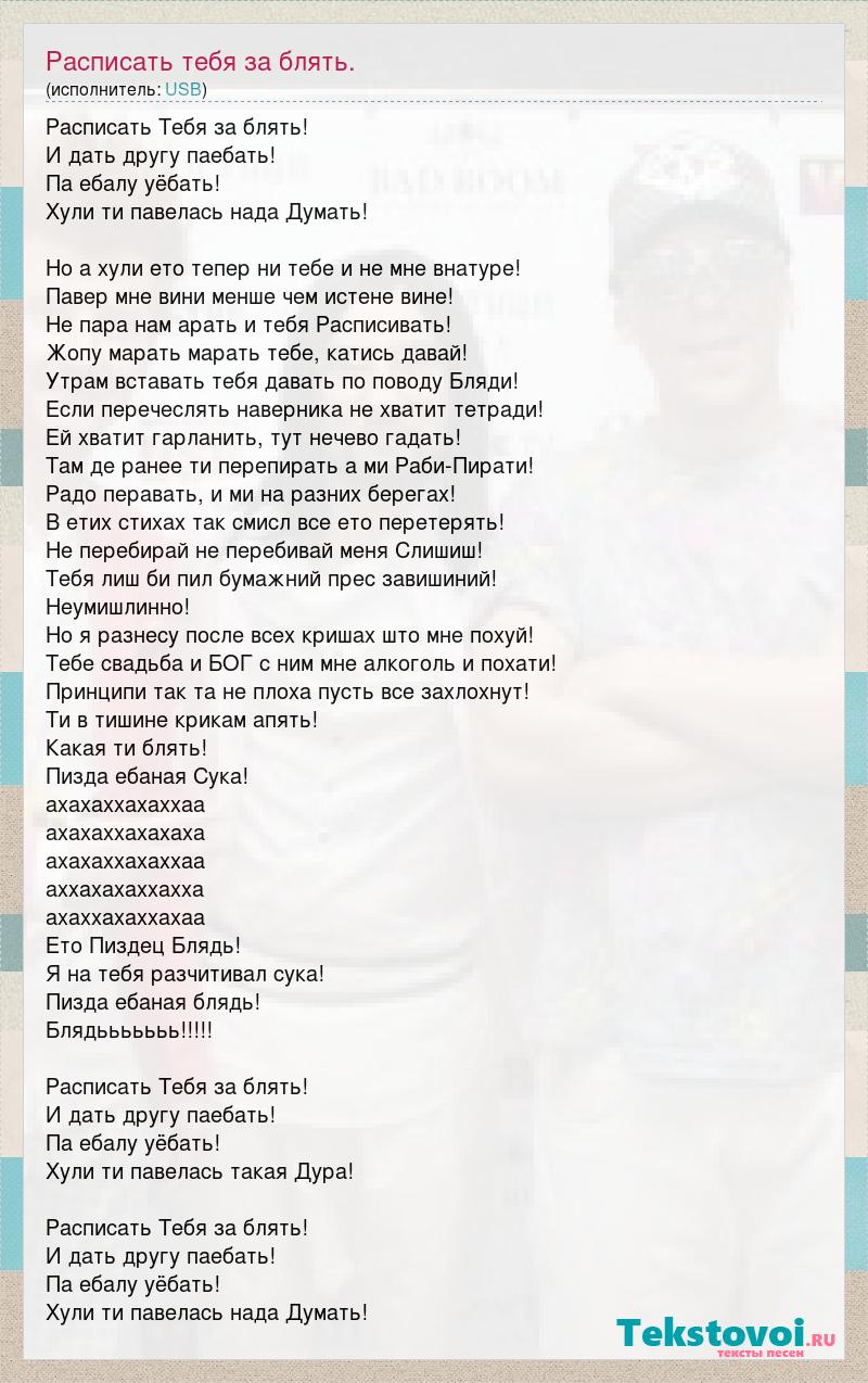 Расписать Тебя за блять! И дать другу паебать! Па ебалу уёбать! Хули ти павелась нада Думать! Но а хули ето тепер ни тебе и не мне внатуре! Павер мне вини менше чем истене вине! Не пара нам арать и тебя Расписивать! Жопу марать марать тебе, катись давай! Утрам вставать тебя давать по поводу Бляди! Если перечеслять наверника не хватит тетради! Ей хватит гарланить, тут нечево гадать! Там де ранее ти перепирать а ми Раби-Пирати! Радо перавать, и ми на разних берегах! В етих стихах так смисл все ето перетерять! Не перебирай не перебивай меня Слишиш! Тебя лиш би пил бумажний прес завишиний! Неумишлинно! Но я разнесу после всех кришах што мне похуй! Тебе свадьба и БОГ с ним мне алкоголь и похати! Принципи так та не плоха пусть все захлохнут! Ти в тишине крикам апять! Какая ти блять! Пизда ебаная Сука! ахахаххахаххаа ахахаххахахаха ахахаххахаххаа аххахахаххахха ахаххахаххахаа Ето Пиздец Блядь! Я на тебя разчитивал сука! Пизда ебаная блядь! Блядььььььь!!!!! Расписать Тебя за блять! И дать другу паебать! Па ебалу уёбать! Хули ти павелась такая Дура! Расписать Тебя за блять! И дать другу паебать! Па ебалу уёбать! Хули ти павелась нада Думать!