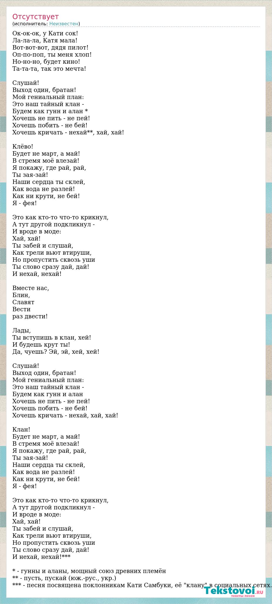 Oк-oк-ок, у Кати сок! Ла-ла-ла, Катя мала! Вот-вот-вот, дядя пилот! Оп-по-поп, ты меня хлоп! Но-но-но, будет кино! Та-та-та, так это мечта! Слушай! Выход один, братан! Мой гениальный план: Это наш тайный клан - Будем как гунн и алан * Хочешь не пить - не пей! Хочешь побить - не бей! Хочешь кричать - нехай**, хай, хай! Клёво! Будет не март, а май! В стремя моё влезай! Я покажу, где рай, рай, Ты зая-зай! Наши сердца ты склей, Как вода не разлей! Как ни крути, не бей! Я - фея! Это как кто-то что-то крикнул, А тут другой подкликнул - И вроде в моде: Хай, хай! Ты забей и слушай, Как трели вьют втируши, Но пропустить сквозь уши Ты слово сразу дай, дай! И нехай, нехай! Вместе нас, Блин, Славят Вести раз двести! Лады, Ты вступишь в клан, хей! И будешь крут ты! Да, чуешь? Эй, эй, хей, хей! Слушай! Выход один, братан! Мой гениальный план: Это наш тайный клан - Будем как гунн и алан Хочешь не пить - не пей! Хочешь побить - не бей! Хочешь кричать - нехай, хай, хай! Клан! Будет не март, а май! В стремя моё влезай! Я покажу, где рай, рай, Ты зая-зай! Наши сердца ты склей, Как вода не разлей! Как ни крути, не бей! Я - фея! Это как кто-то что-то крикнул, А тут другой подкликнул - И вроде в моде: Хай, хай! Ты забей и слушай, Как трели вьют втируши, Но пропустить сквозь уши Ты слово сразу дай, дай! И нехай, нехай!*** * - гунны и аланы, мощный союз древних племён ** - пусть, пускай (юж.-рус., укр.) *** - песня посвящена поклонникам Кати Самбуки, её "клану" в социальных сетях.