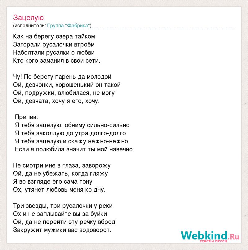 Как на берегу озера тайком Загорали русалочки втроём Наболтали русалки о любви Кто кого заманил в свои сети. Чу! По берегу парень да молодой Ой, девчонки, хорошенький он такой Ой, подружки, влюбилася, не могу Ой, девчата, хочу я его, хочу. Припев: Я тебя зацелую, обниму сильно-сильно Я тебя заколдую до утра долго-долго Я тебя зацелую и скажу нежно-нежно Если я полюбила значит ты мой навечно. Не смотри мне в глаза, заворожу Ой, да не убежать, когда гляжу Я во взгляде его сама тону Ох, утянет любовь меня ко дну. Три звезды, три русалочки у реки Ох и не заплывайте вы за буйки Ой, да не перейти эту речку вброд Закружит мужики вас водоворот.