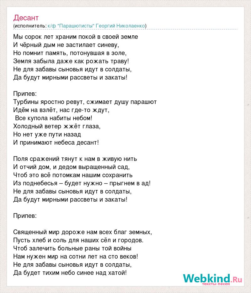 Мы сорок лет храним покой в своей земле И чёрный дым не застилает синеву, Но помнит память, потонувшая в золе, Земля забыла даже как рожать траву! Не для забавы сыновья идут в солдаты, Да будут мирными рассветы и закаты! Припев: Турбины яростно ревут, сжимает душу парашют Идём на взлёт, нас где-то ждут, Все купола набиты небом! Холодный ветер жжёт глаза, Но нет уже пути назад И принимают небеса десант! Поля сражений тянут к нам в живую нить И отчий дом, и дедом выращенный сад, Чтоб это всё потомкам нашим сохранить Из поднебесья – будет нужно – прыгнем в ад! Не для забавы сыновья идут в солдаты, Да будут мирными рассветы и закаты! Припев: Священный мир дороже нам всех благ земных, Пусть хлеб и соль для наших сёл и городов. Чтоб залечить больные раны той войны Нам нужен мир на сотни лет на сто веков! Не для забавы сыновья идут в солдаты, Да будет тихим небо синее над хатой!