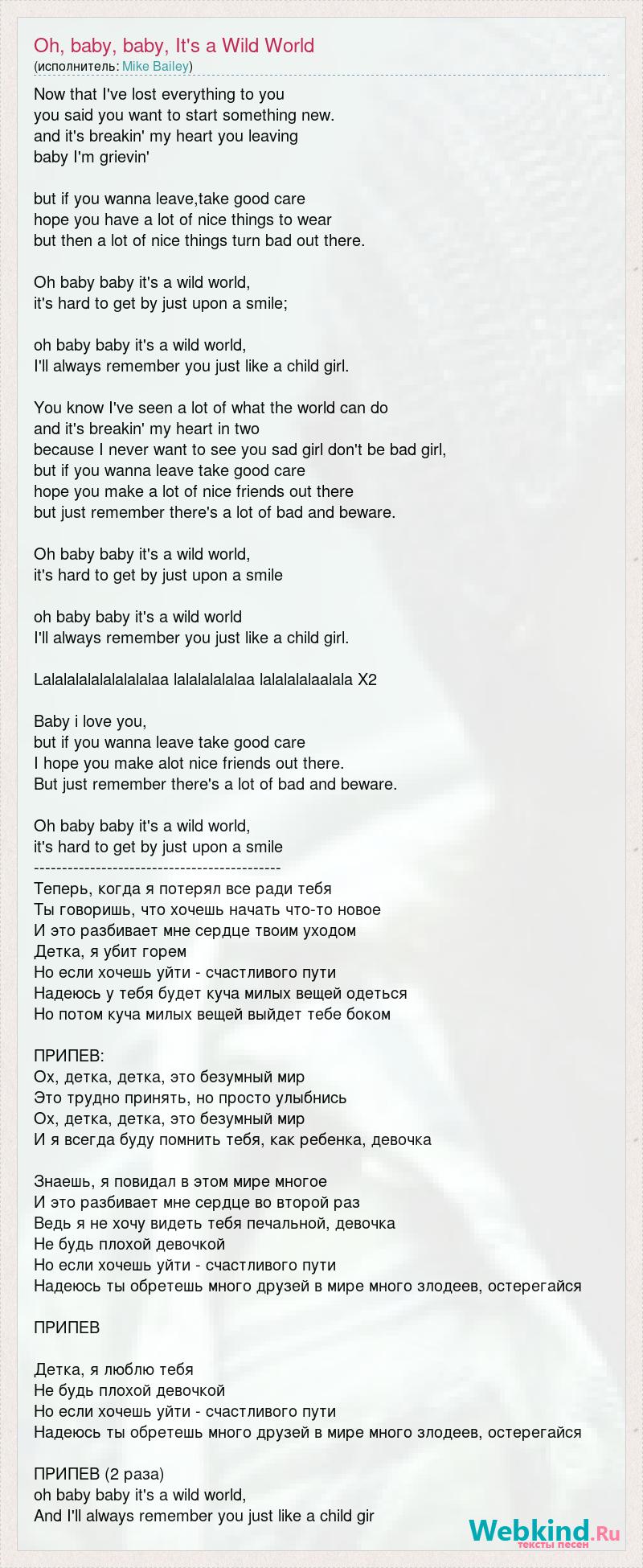 Now that I've lost everything to you you said you want to start something new. and it's breakin' my heart you leaving baby I'm grievin' but if you wanna leave,take good care hope you have a lot of nice things to wear but then a lot of nice things turn bad out there. Oh baby baby it's a wild world, it's hard to get by just upon a smile; oh baby baby it's a wild world, I'll always remember you just like a child girl. You know I've seen a lot of what the world can do and it's breakin' my heart in two because I never want to see you sad girl don't be bad girl, but if you wanna leave take good care hope you make a lot of nice friends out there but just remember there's a lot of bad and beware. Oh baby baby it's a wild world, it's hard to get by just upon a smile oh baby baby it's a wild world I'll always remember you just like a child girl. Lalalalalalalalalalaa lalalalalalaa lalalalalaalala X2 Baby i love you, but if you wanna leave take good care I hope you make alot nice friends out there. But just remember there's a lot of bad and beware. Oh baby baby it's a wild world, it's hard to get by just upon a smile -------------------------------------------- Теперь, когда я потерял все ради тебя Ты говоришь, что хочешь начать что-то новое И это разбивает мне сердце твоим уходом Детка, я убит горем Но если хочешь уйти - счастливого пути Надеюсь у тебя будет куча милых вещей одеться Но потом куча милых вещей выйдет тебе боком ПРИПЕВ: Ох, детка, детка, это безумный мир Это трудно принять, но просто улыбнись Ох, детка, детка, это безумный мир И я всегда буду помнить тебя, как ребенка, девочка Знаешь, я повидал в этом мире многое И это разбивает мне сердце во второй раз Ведь я не хочу видеть тебя печальной, девочка Не будь плохой девочкой Но если хочешь уйти - счастливого пути Надеюсь ты обретешь много друзей в мире много злодеев, остерегайся ПРИПЕВ Детка, я люблю тебя Не будь плохой девочкой Но если хочешь уйти - счастливого пути Надеюсь ты обретешь много друзей в мире много злодеев, остерегайся ПРИПЕВ (2 раза) oh baby baby it's a wild world, And I'll always remember you just like a child gir