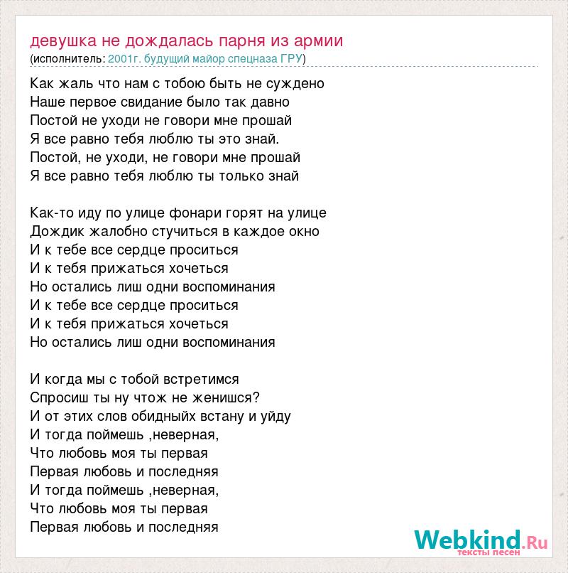 Как жаль что нам с тобою быть не суждено Наше первое свидание было так давно Постой не уходи не говори мне прошай Я все равно тебя люблю ты это знай. Постой, не уходи, не говори мне прошай Я все равно тебя люблю ты только знай Как-то иду по улице фонари горят на улице Дождик жалобно стучиться в каждое окно И к тебе все сердце проситься И к тебя прижаться хочеться Но остались лиш одни воспоминания И к тебе все сердце проситься И к тебя прижаться хочеться Но остались лиш одни воспоминания И когда мы с тобой встретимся Спросиш ты ну чтож не женишся? И от этих слов обидныйх встану и уйду И тогда поймешь ,неверная, Что любовь моя ты первая Первая любовь и последняя И тогда поймешь ,неверная, Что любовь моя ты первая Первая любовь и последняя