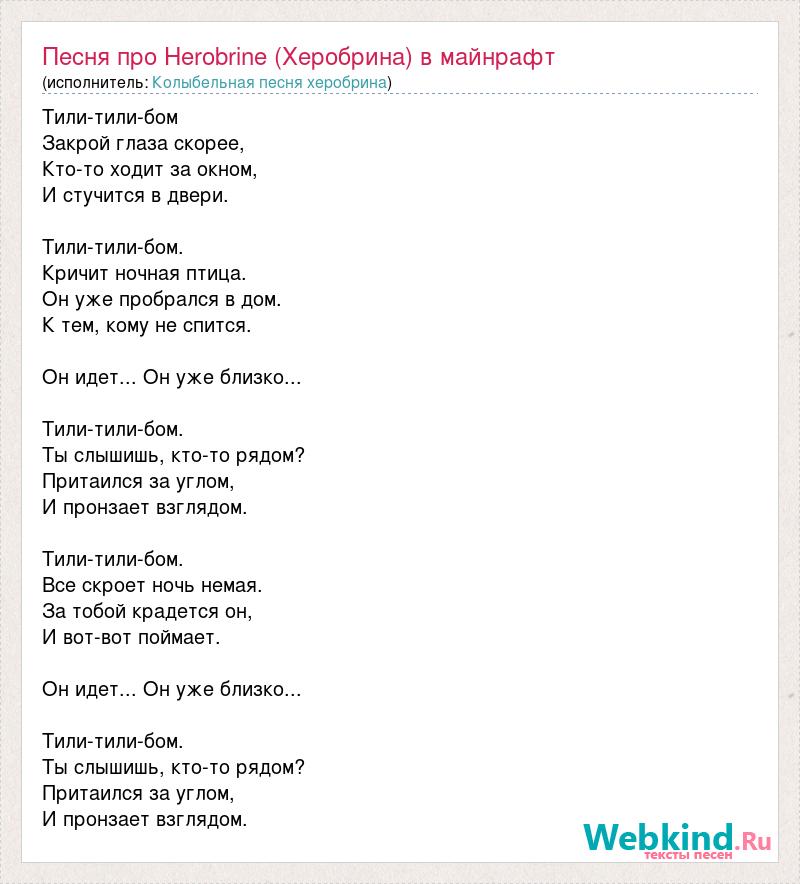 Тили-тили-бом Закрой глаза скорее, Кто-то ходит за окном, И стучится в двери. Тили-тили-бом. Кричит ночная птица. Он уже пробрался в дом. К тем, кому не спится. Он идет... Он уже близко... Тили-тили-бом. Ты слышишь, кто-то рядом? Притаился за углом, И пронзает взглядом. Тили-тили-бом. Все скроет ночь немая. За тобой крадется он, И вот-вот поймает. Он идет... Он уже близко... Тили-тили-бом. Ты слышишь, кто-то рядом? Притаился за углом, И пронзает взглядом.