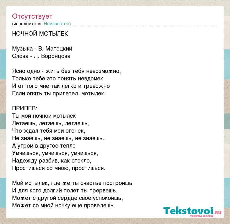 НОЧНОЙ МОТЫЛЕК Музыка - В. Матецкий Слова - Л. Воронцова Ясно одно - жить без тебя невозможно, Только тебе это понять невдомек. И от того мне так легко и тревожно Если опять ты прилетел, мотылек. ПРИПЕВ: Ты мой ночной мотылек Летаешь, летаешь, летаешь, Что ждал тебя мой огонек, Не знаешь, не знаешь, не знаешь. А утром в другое тепло Умчишься, умчишься, умчишься, Надежду разбив, как стекло, Простишься со мною, простишься. Мой мотылек, где же ты счастье построишь И для кого долгий полет ты прервешь. Может с другой сердце свое успокоишь, Может со мной ночку еще проведешь.