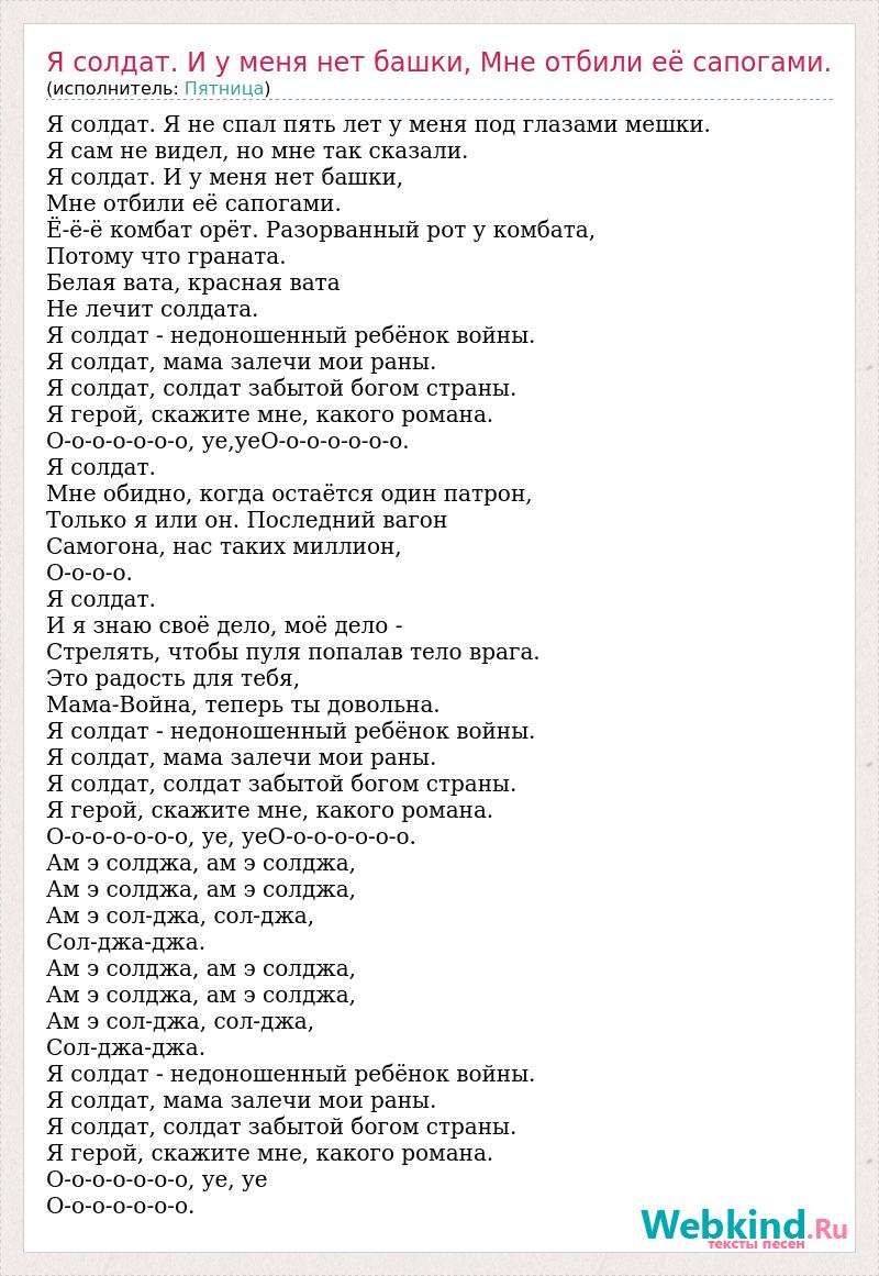 Я солдат. Я не спал пять лет у меня под глазами мешки. Я сам не видел, но мне так сказали. Я солдат. И у меня нет башки, Мне отбили её сапогами. Ё-ё-ё комбат орёт. Разорванный рот у комбата, Потому что граната. Белая вата, красная вата Hе лечит солдата. Я солдат - недоношенный ребёнок войны. Я солдат, мама залечи мои раны. Я солдат, солдат забытой богом страны. Я герой, скажите мне, какого романа. О-о-о-о-о-о-о, уе,уеО-о-о-о-о-о-о. Я солдат. Мне обидно, когда остаётся один патрон, Только я или он. Последний вагон Самогона, нас таких миллион, О-о-о-о. Я солдат. И я знаю своё дело, моё дело - Стрелять, чтобы пуля попалав тело врага. Это радость для тебя, Мама-Война, теперь ты довольна. Я солдат - недоношенный ребёнок войны. Я солдат, мама залечи мои раны. Я солдат, солдат забытой богом страны. Я герой, скажите мне, какого романа. О-о-о-о-о-о-о, уе, уеО-о-о-о-о-о-о. Ам э солджа, ам э солджа, Ам э солджа, ам э солджа, Ам э сол-джа, сол-джа, Сол-джа-джа. Ам э солджа, ам э солджа, Ам э солджа, ам э солджа, Ам э сол-джа, сол-джа, Сол-джа-джа. Я солдат - недоношенный ребёнок войны. Я солдат, мама залечи мои раны. Я солдат, солдат забытой богом страны. Я герой, скажите мне, какого романа. О-о-о-о-о-о-о, уе, уе О-о-о-о-о-о-о.