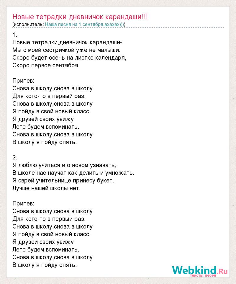 1. Новые тетрадки,дневничок,карандаши- Мы с моей сестричкой уже не малыши. Скоро будет осень на листке календаря, Скоро первое сентября. Припев: Снова в школу,снова в школу Для кого-то в первый раз. Снова в школу,снова в школу Я пойду в свой новый класс. Я друзей своих увижу Лето будем вспоминать. Снова в школу,снова в школу В школу я пойду опять. 2. Я люблю учиться и о новом узнавать, В школе нас научат как делить и умножать. Я сврей учительнице принесу букет. Лучше нашей школы нет. Припев: Снова в школу,снова в школу Для кого-то в первый раз. Снова в школу,снова в школу Я пойду в свой новый класс. Я друзей своих увижу Лето будем вспоминать. Снова в школу,снова в школу В школу я пойду опять.