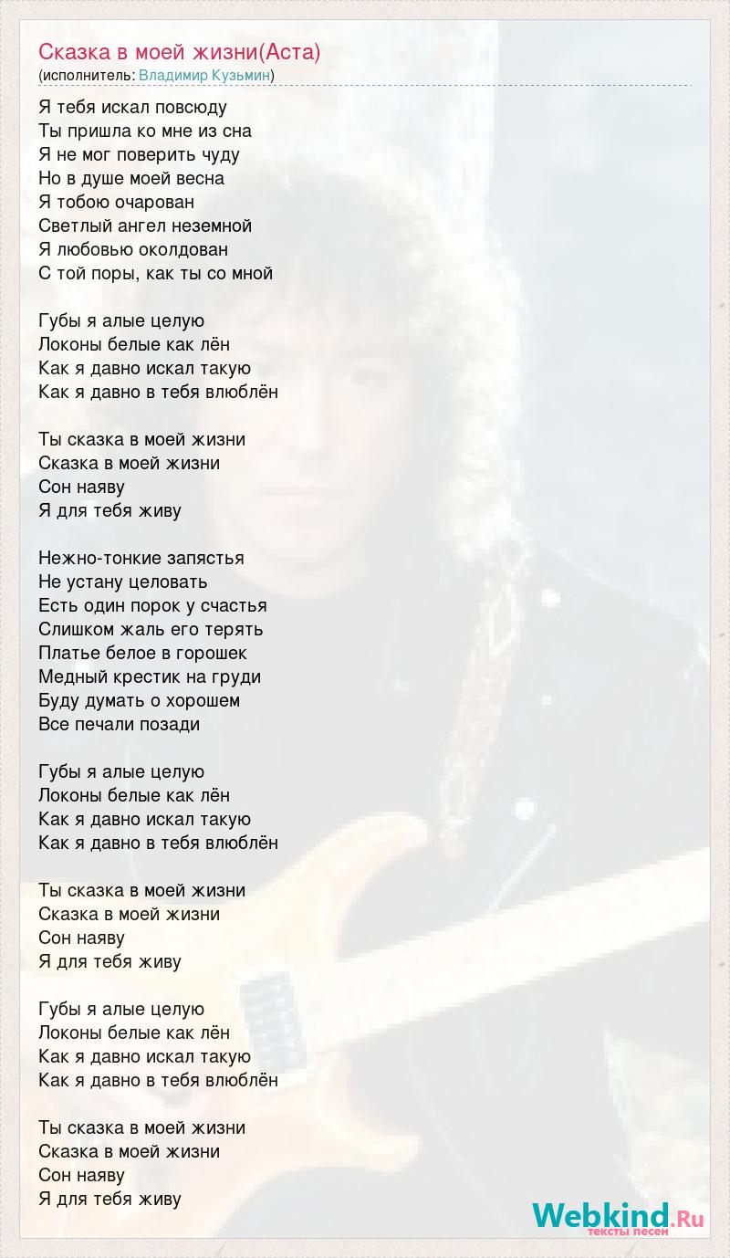 Я тебя искал повсюду Ты пришла ко мне из сна Я не мог поверить чуду Но в душе моей весна Я тобою очарован Светлый ангел неземной Я любовью околдован С той поры, как ты со мной Губы я алые целую Локоны белые как лён Как я давно искал такую Как я давно в тебя влюблён Ты сказка в моей жизни Сказка в моей жизни Сон наяву Я для тебя живу Нежно-тонкие запястья Не устану целовать Есть один порок у счастья Слишком жаль его терять Платье белое в горошек Медный крестик на груди Буду думать о хорошем Все печали позади Губы я алые целую Локоны белые как лён Как я давно искал такую Как я давно в тебя влюблён Ты сказка в моей жизни Сказка в моей жизни Сон наяву Я для тебя живу Губы я алые целую Локоны белые как лён Как я давно искал такую Как я давно в тебя влюблён Ты сказка в моей жизни Сказка в моей жизни Сон наяву Я для тебя живу
