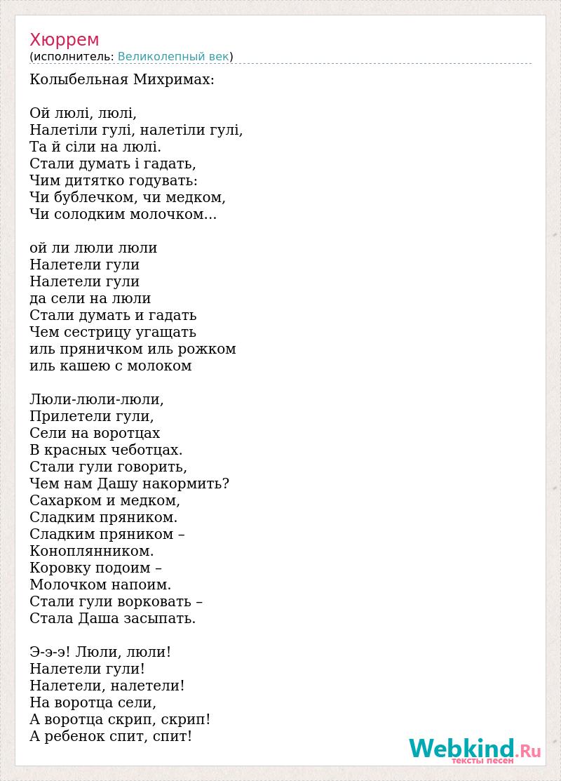 Колыбельная Михримах: Ой люлі, люлі, Налетіли гулі, налетіли гулі, Та й сіли на люлі. Стали думать і гадать, Чим дитятко годувать: Чи бублечком, чи медком, Чи солодким молочком... ой ли люли люли Налетели гули Налетели гули да сели на люли Стали думать и гадать Чем сестрицу угащать иль пряничком иль рожком иль кашею с молоком Люли-люли-люли, Прилетели гули, Сели на воротцах В красных чеботцах. Стали гули говорить, Чем нам Дашу накормить? Сахарком и медком, Сладким пряником. Сладким пряником – Коноплянником. Коровку подоим – Молочком напоим. Стали гули ворковать – Стала Даша засыпать. Э-э-э! Люли, люли! Налетели гули! Налетели, налетели! На воротца сели, А воротца скрип, скрип! А ребенок спит, спит!